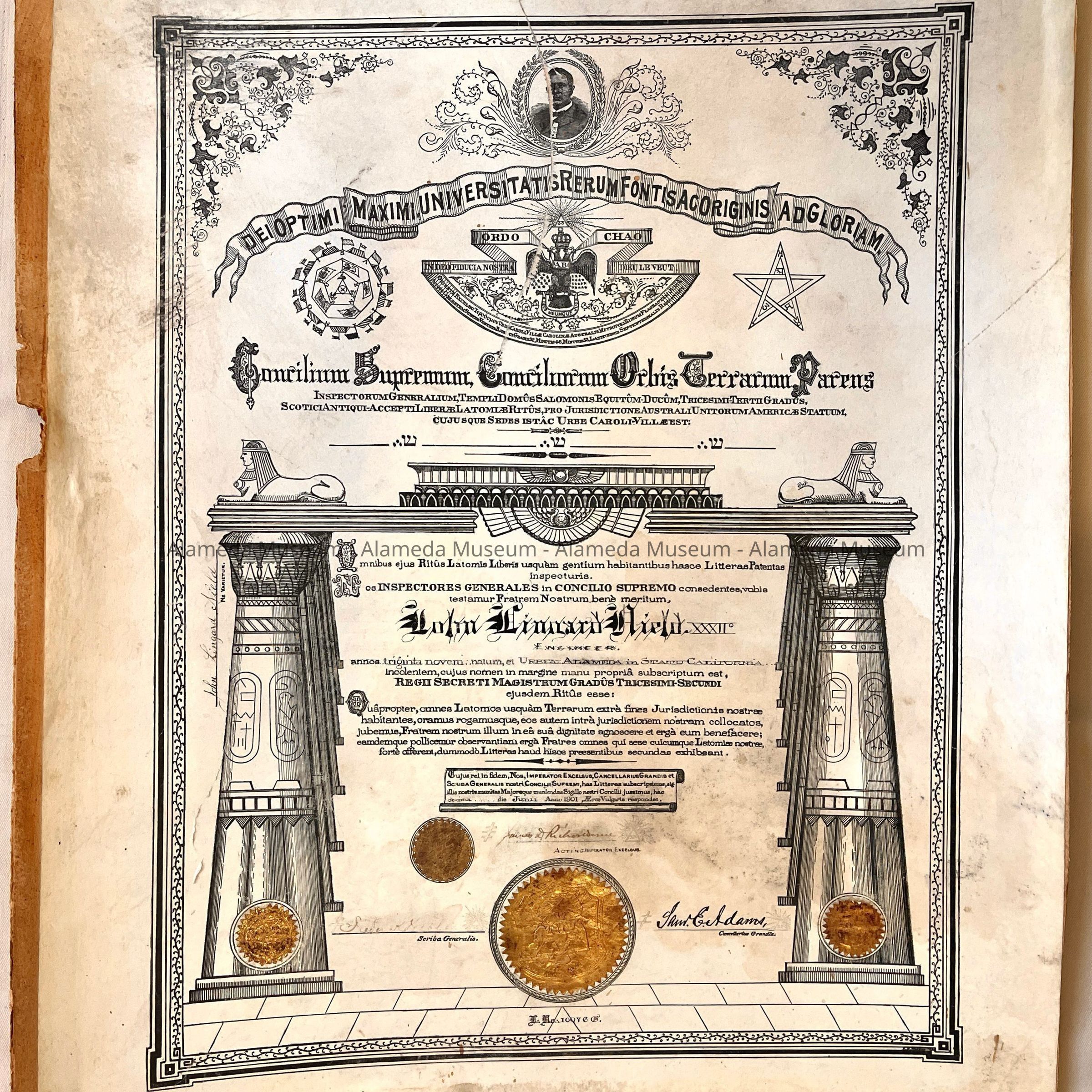 Fraternal certificate awarded John Lingard Nield, old-time resident of Alameda.