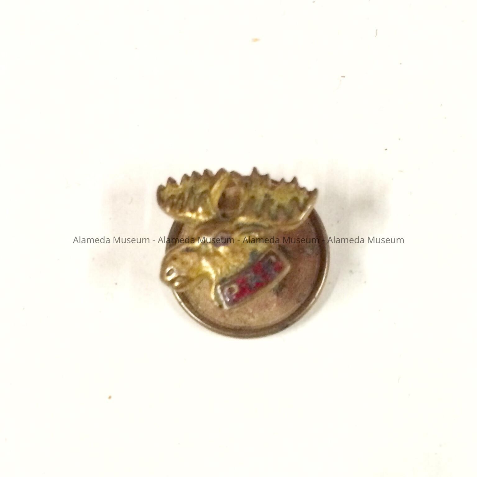 A STUD-TYPE FRATERNAL PIN, WITH DECORATIVE DESIGN OF AN EMBOSSED ELK'S HEAD WITH ANTLERS. ELK HAS A COLLAR OF RED ENAMEL AND THE LETTERS, "P A P." PIN APPEARS TO BE GOLD-PLATED.