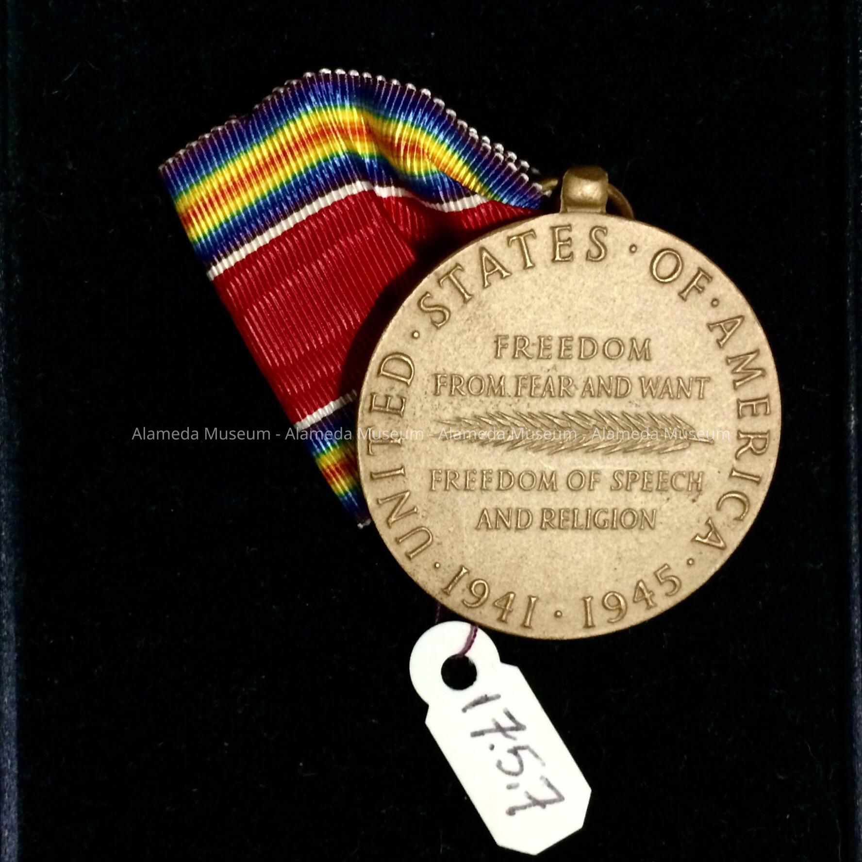 Description: A circular-shaped medal supported by a multi-colored silk faille ribbon. The underside states, "United States of America" and lists the "Four Freedoms" freedom from fear, want, freedom of speech and religion.