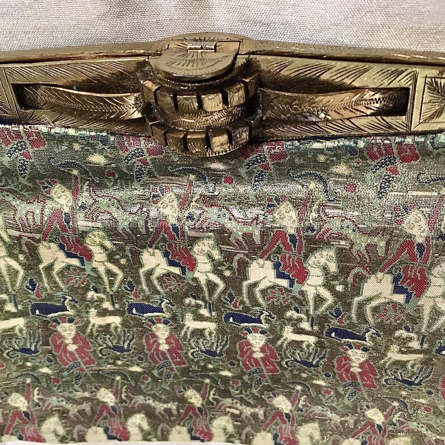 EVENING PURSE OF SILK BROCADE, ACCENTUATED WITH GOLD THREADING. THE PURSE MOUNT APPEARS TO BE GOLD-WASHED BRASS, WITH AN INCISED DESIGN. INTERIOR IS LINED WITH OFF-WHITE-COLORED SILK. LINING READS, "MADE IN FRANCE."