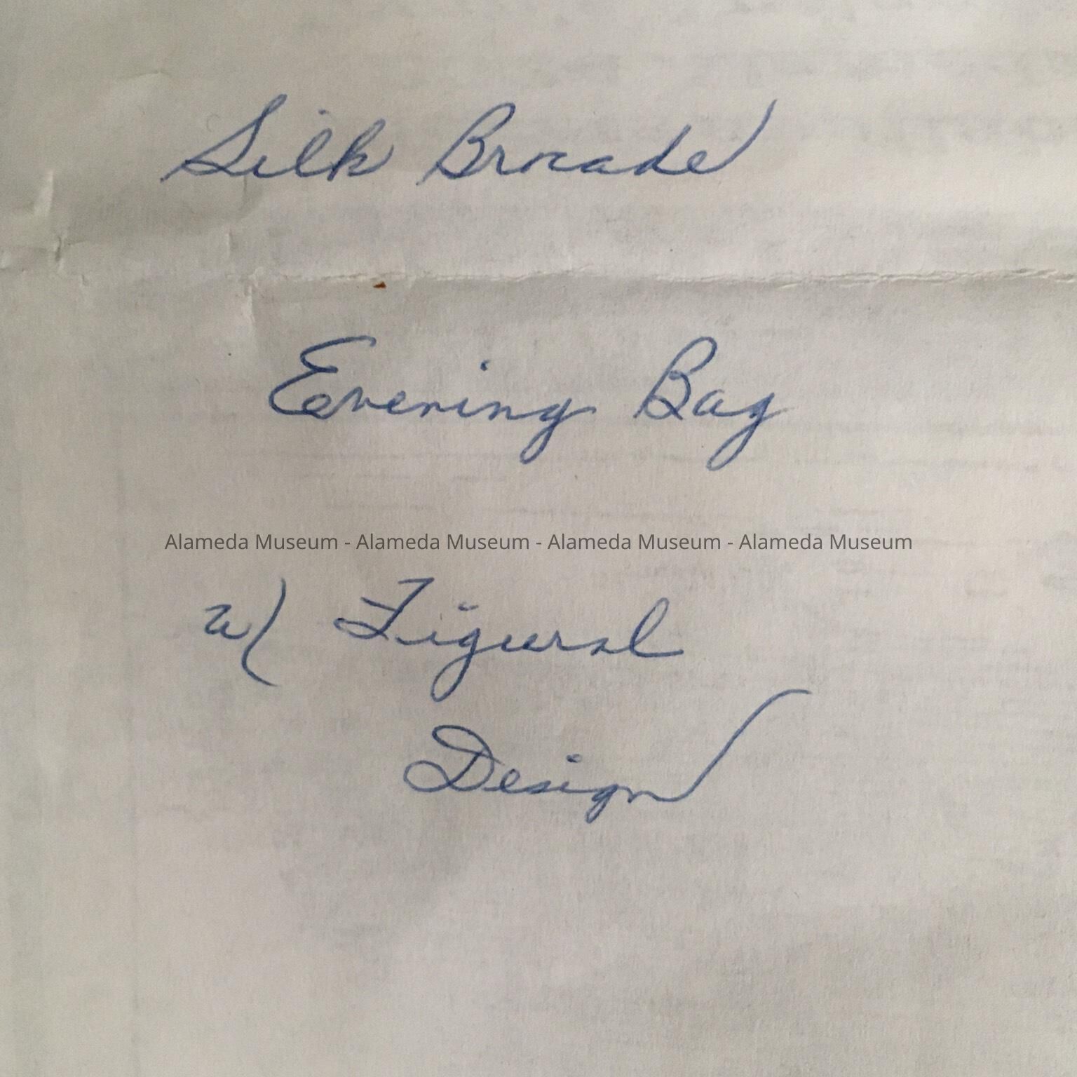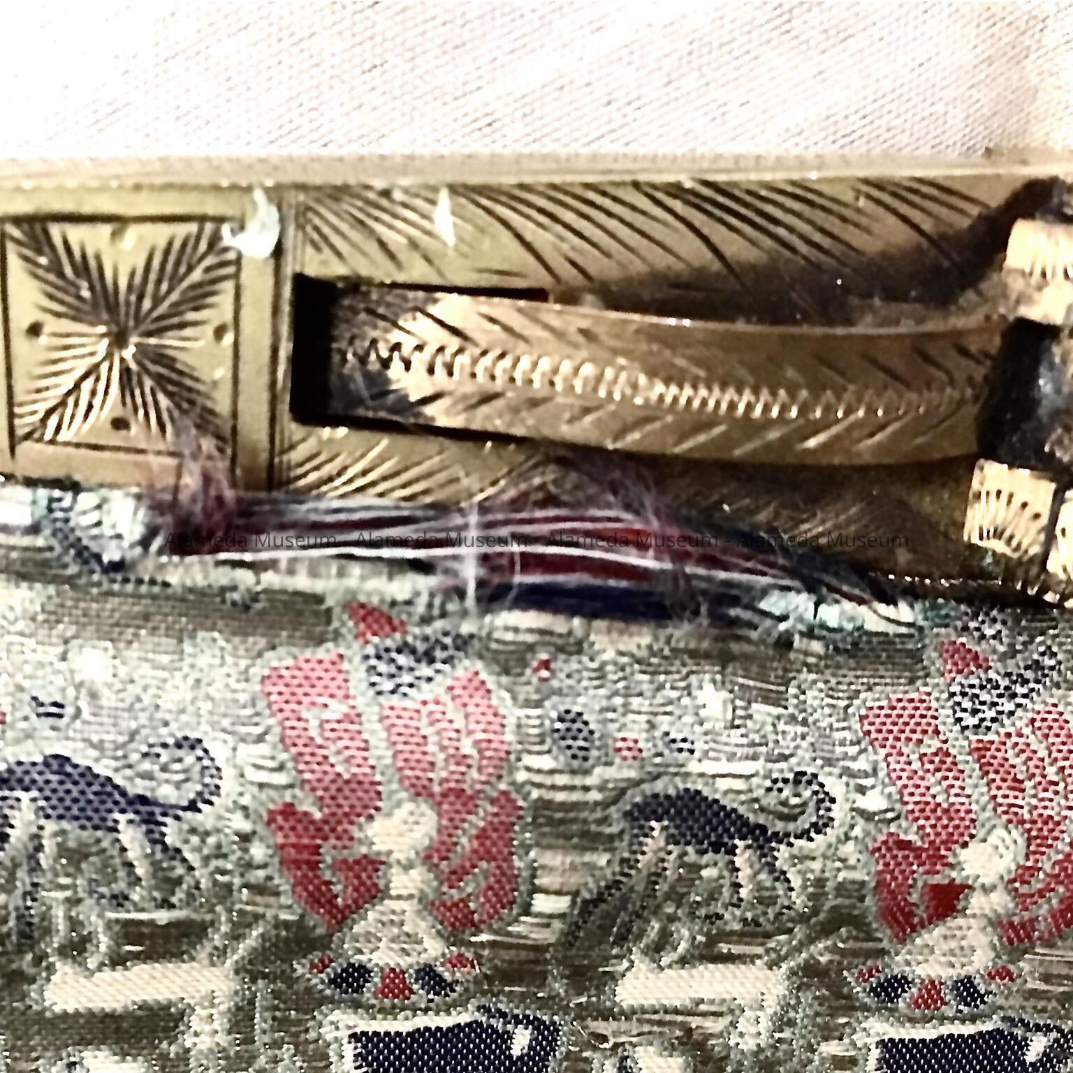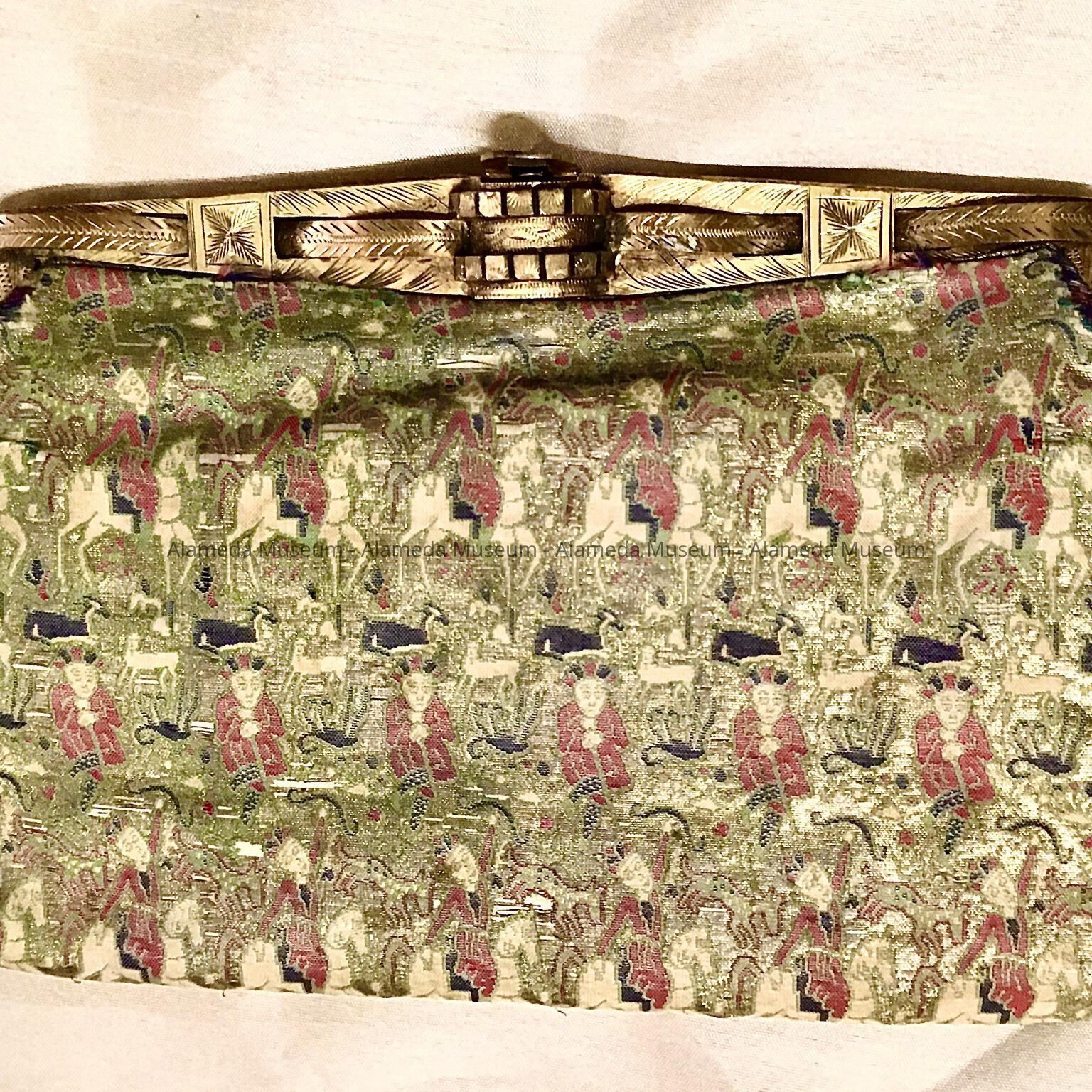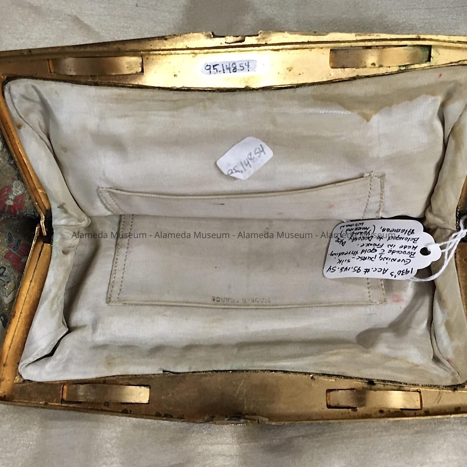 Evening purse - silk Brocade with c. gold threading. Made in France. Belonged to Dorothy Dyer, Alameda, (Young Married woman)