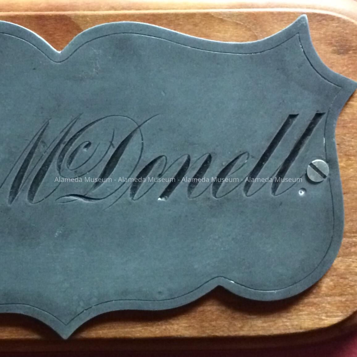 History of object: Front door plate of the Powell A. McDonell home, Bay Farm Island, Alameda. The McDonell family were early pioneers of the island, owning and farming a large tract of land there. McDonell, Benedict, Cleveland, & McCartney families were the first settlers of the island. At one time there was a road on the island named in honor of the McDonell family.