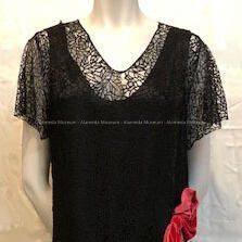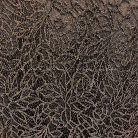 A FULL-LENGTH GOWN OF MACHINE-MADE BLACK-COLORED LACE IN A FLORAL DESIGN. LOWER SECTION IS GATHERED. IT ALSO HAS A SLIP, WITH STRAPS, IN BLACK-COLORED SILK. FRONT OF DRESS HAS AN APPLIED SILK VELVET RIBBON IN A WINE COLOR (WHICH MAY NOT BE ORIGINAL).