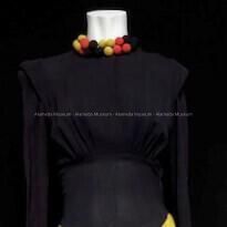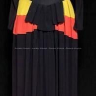 A ONE-PIECE FULL-LENGTH DRESS OF RAYON CREPE, CONSISTING OF THE UPPER SECTION IN BLACK TO THE WAISTLINE, THEN AN ORIGINAL BAND OF GATHERED HORIZONTAL PANELS OF CHARTREUSE- AND ORANGE-COLORED CREPE, ENDING IN A HEM OF MATCHING BLACK-COLORED CREPE. DECORATIVE DETAIL CONSISTS OF BLACK-, ORANGE-, AND CHARTREUSE COLORED CREPE. COVERED BALLS AT THE NECKLINE CREATE A DECORATIVE TOUCH. FULL-LENGTH SLEEVES THAT HAVE SNAPS AT THE OPENINGS. NO DRESS LABEL. SIDE ZIPPER.