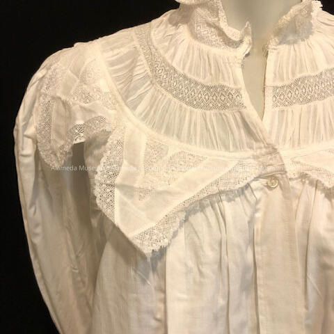 Nightgown worn by Sophia May, mother of Mrs. Bertha Meyers, wife of Henry H. (noted architect). Mrs. May lived with her daughter & son-in-law at 2021 Alameda Avenue.