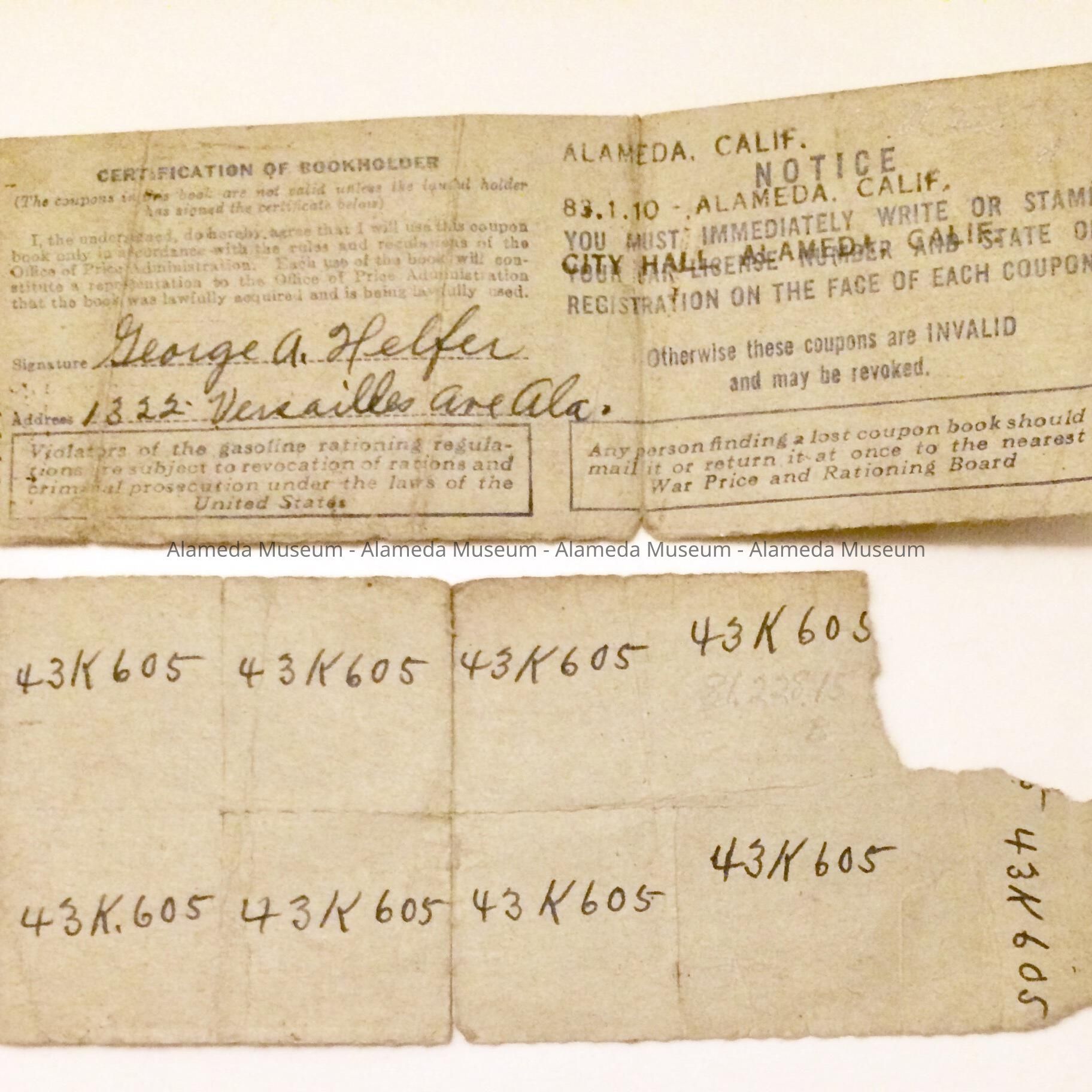 History of Object: These are remnants of a gas ration book issued to George Anton Helfer.