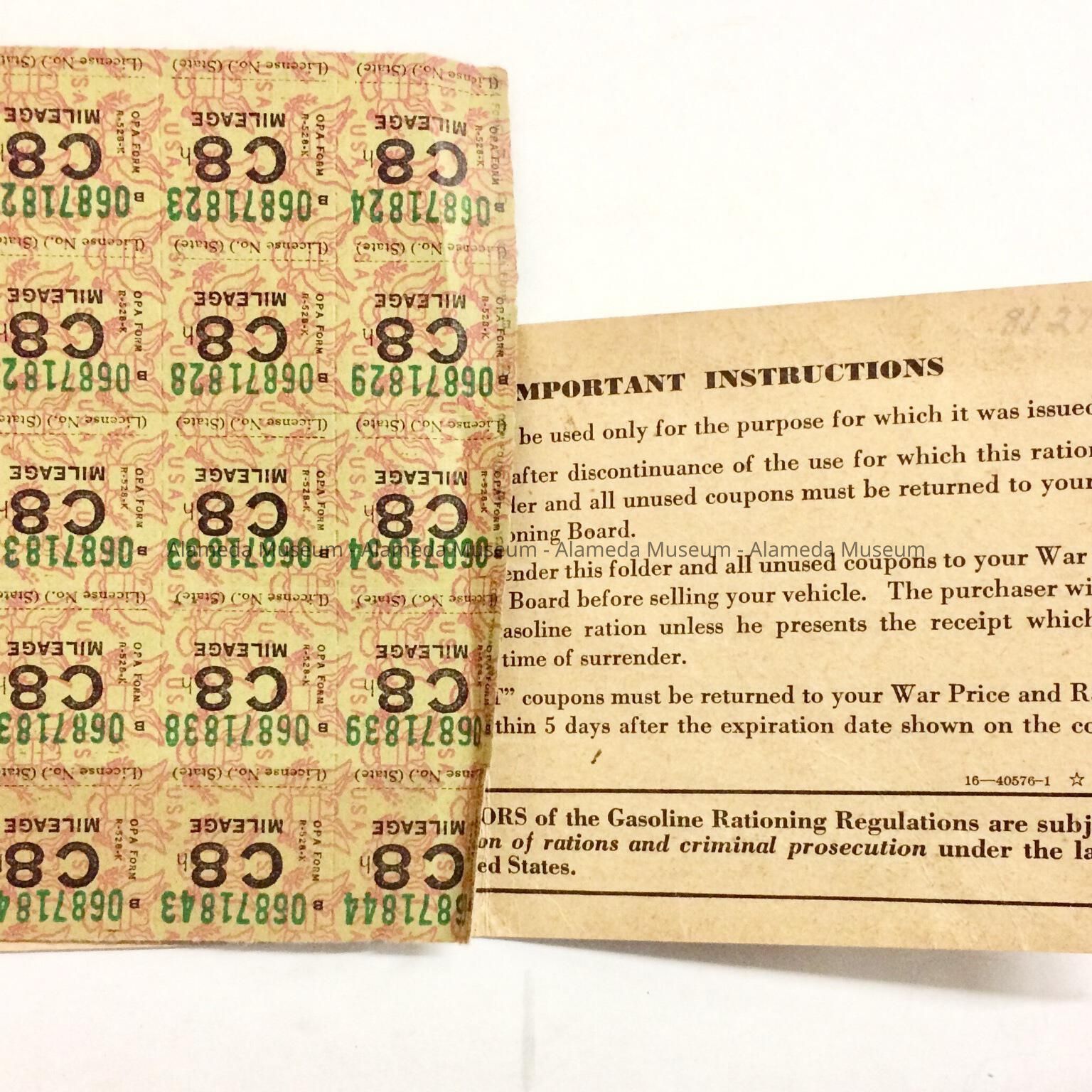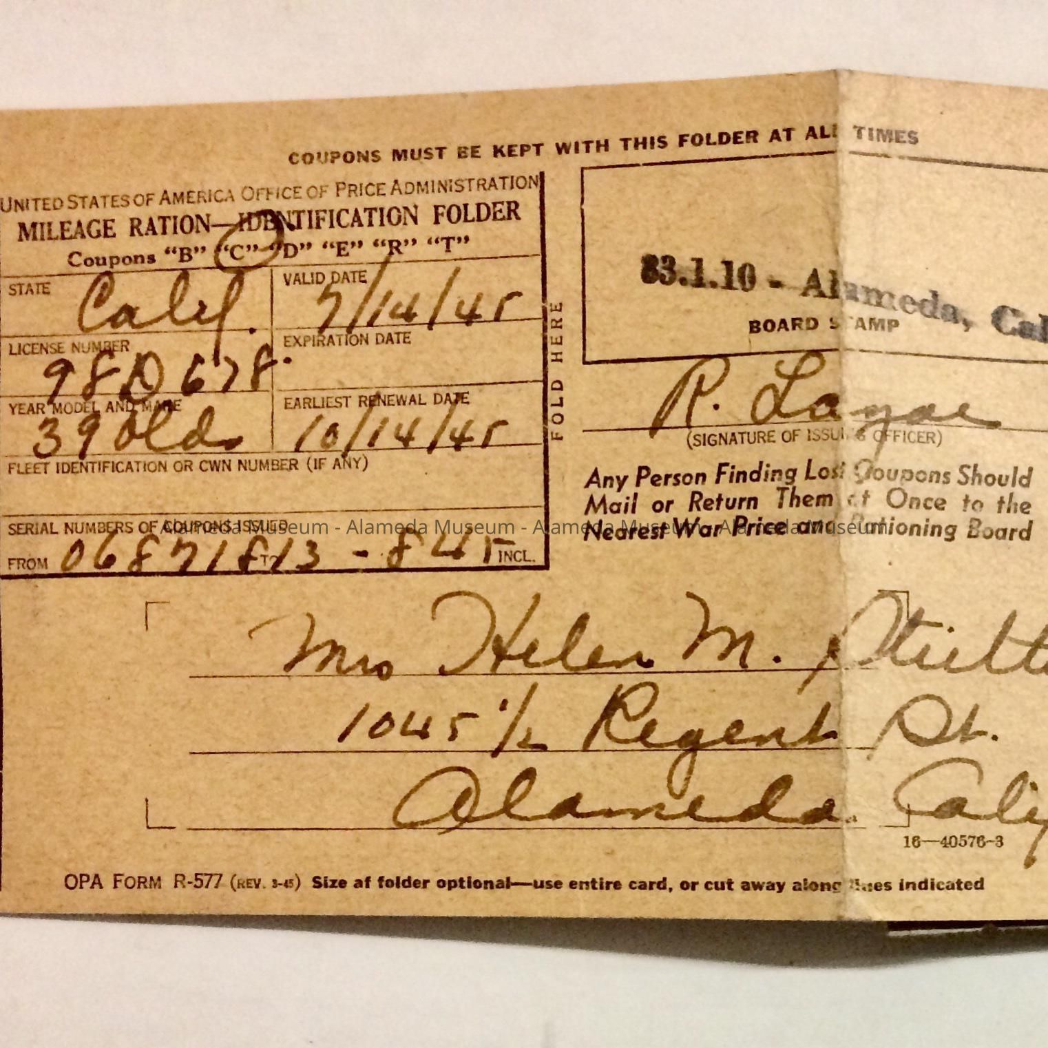 History of Object: Gas rations stamps issued to Mrs. Helen M. Stutter, 1045½ Regent Street, Alameda, Calif.