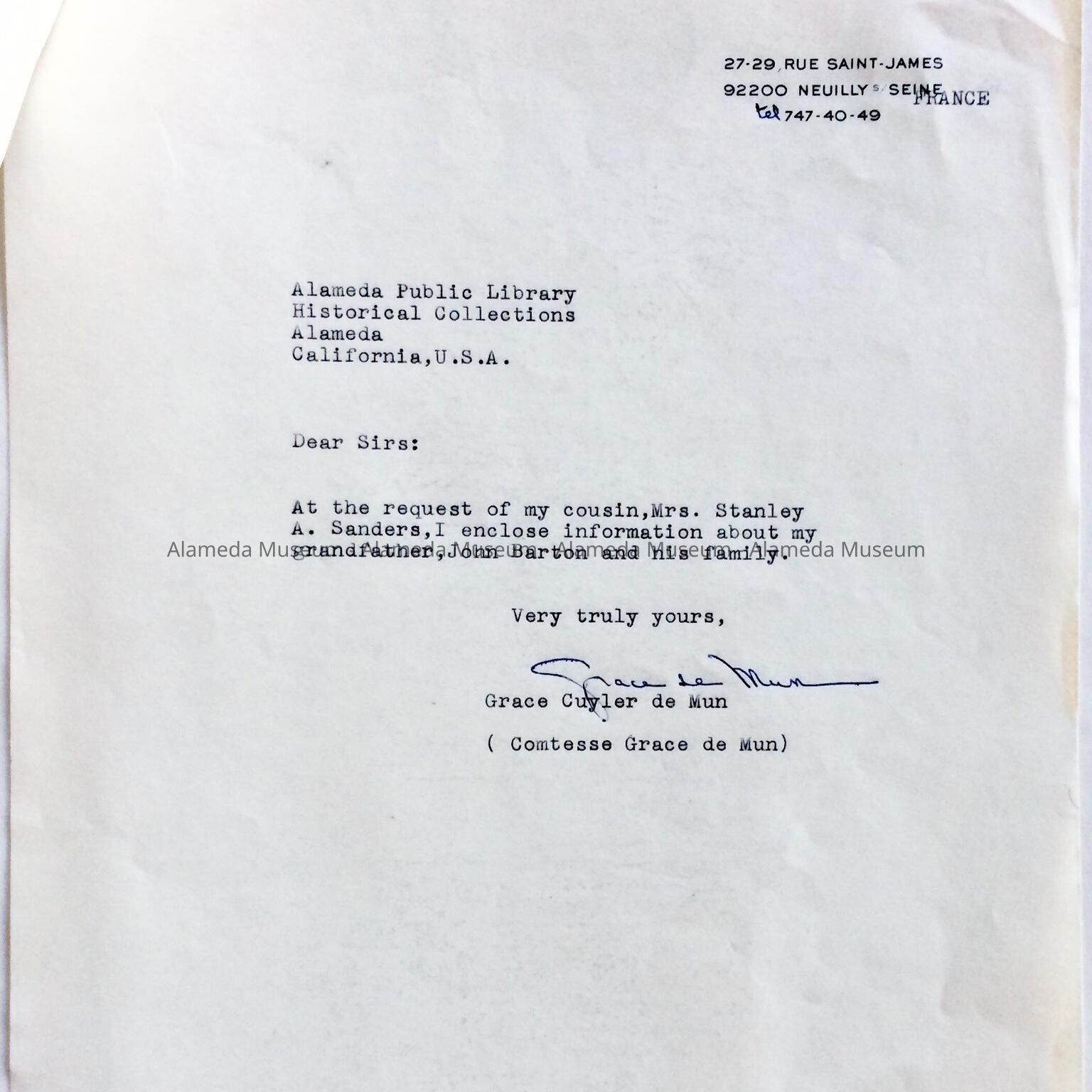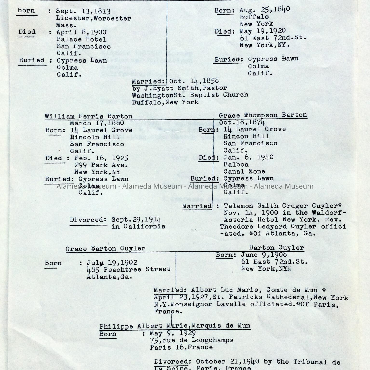 Genealogy of John Barton, early resident of Alameda. Mr. Barton was the president of the Union Pacific Salt Co., San Francisco, and occupied a mansion that stood at the present site of the Hotel Alameda. The genealogy was composed by his granddaughter, given to the Alameda Museum in 1974, and never catalogued.