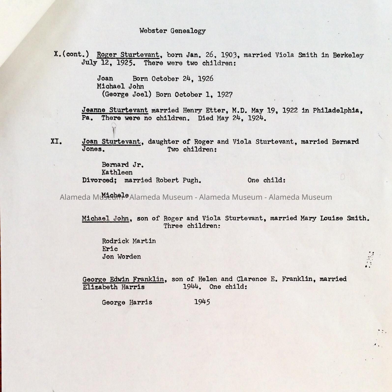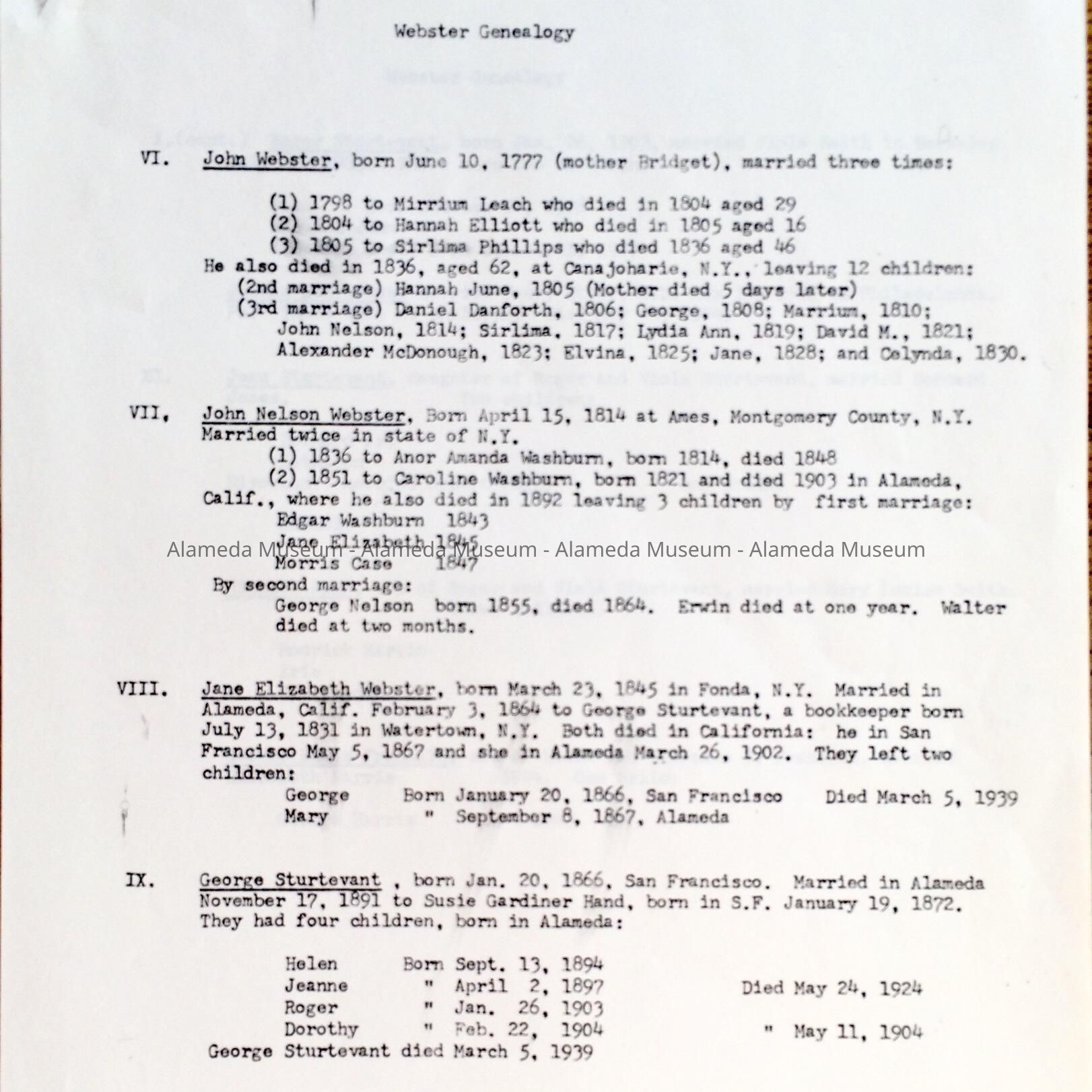 GENEALOGY STUDY OF THE WEBSTER FAMILY, FOCUSING ON JOHN NELSON WEBSTER AND DESCENDANTS, ALAMEDA, CA. THE WEBSTER FAMILY HAD CONSTRUCTED THE HOME AT 1238 VERSAILLES AVENUE, OLDEST DOCUMENTED HOUSE IN ALAMEDA.