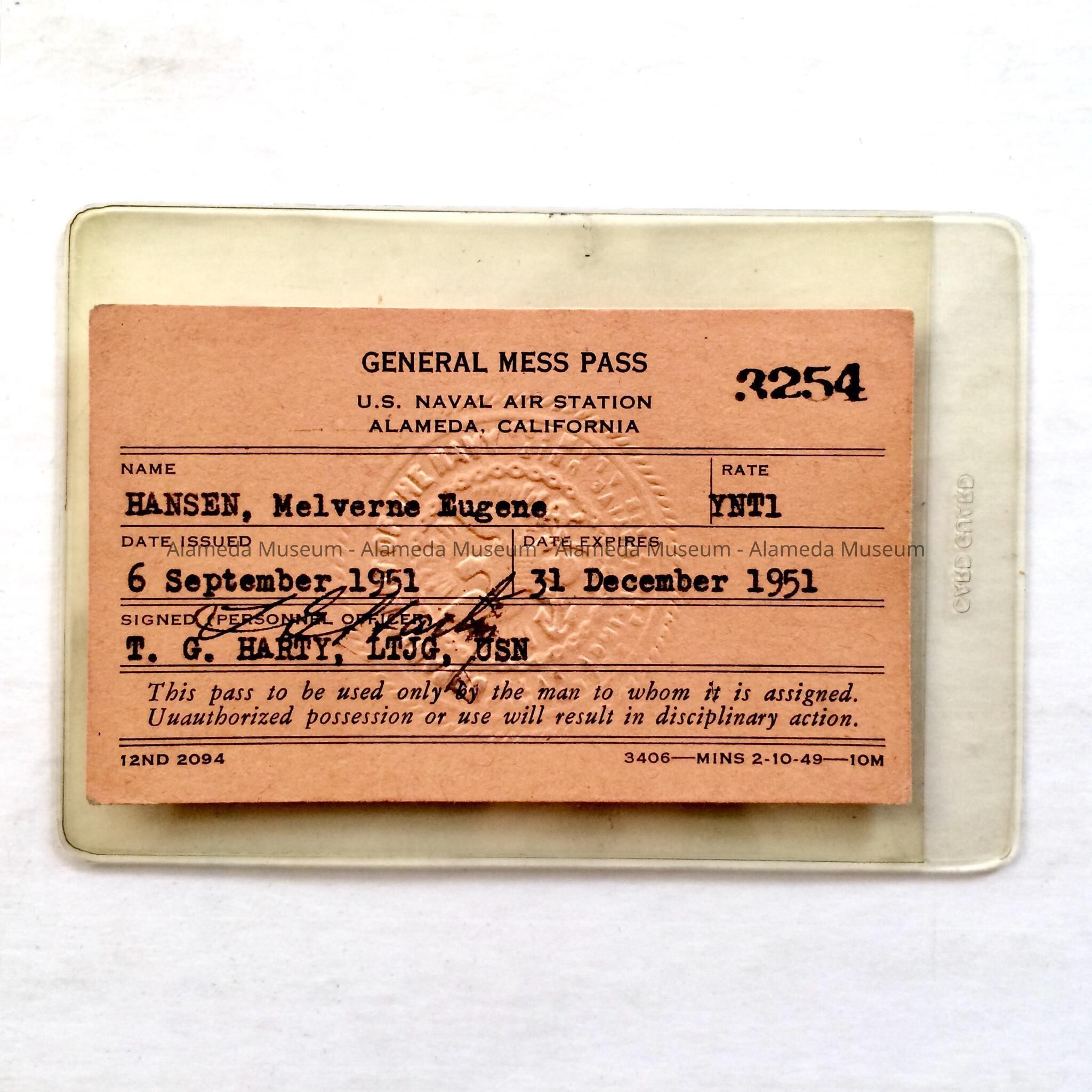 HISTORY OF OBJECT: A GENERAL MESS PASS FOR THE U.S. NAVAL AIR STATION, ALAMEDA ISSUED BY MELVERNE EUGENE HANSEN FOR THE PERIOD SEPTEMBER 6, 1951 TO DECEMBER 31, 1951.