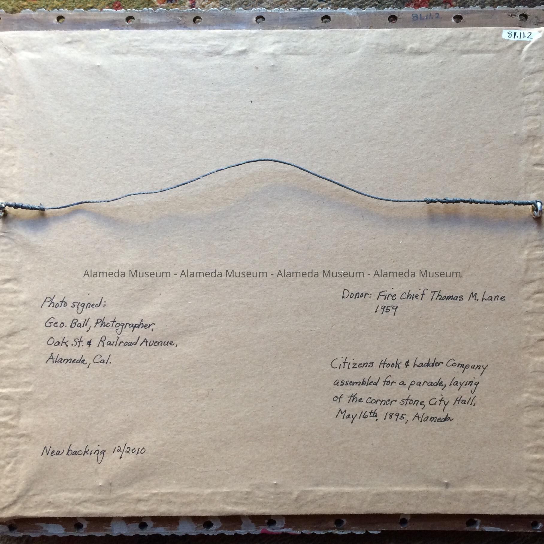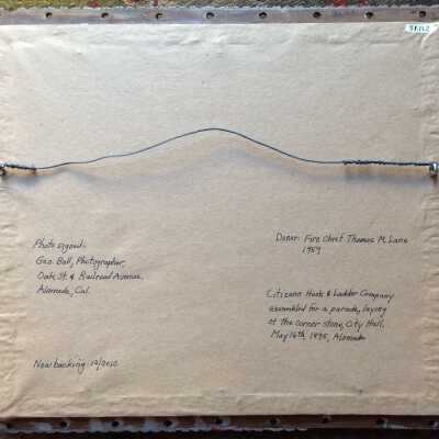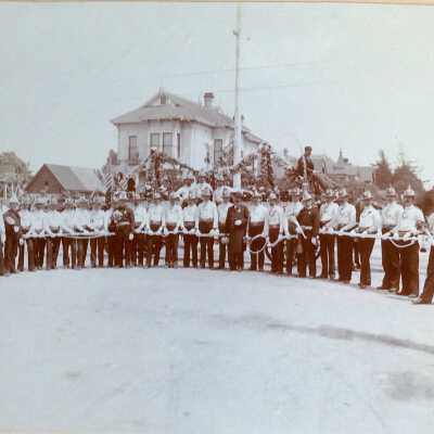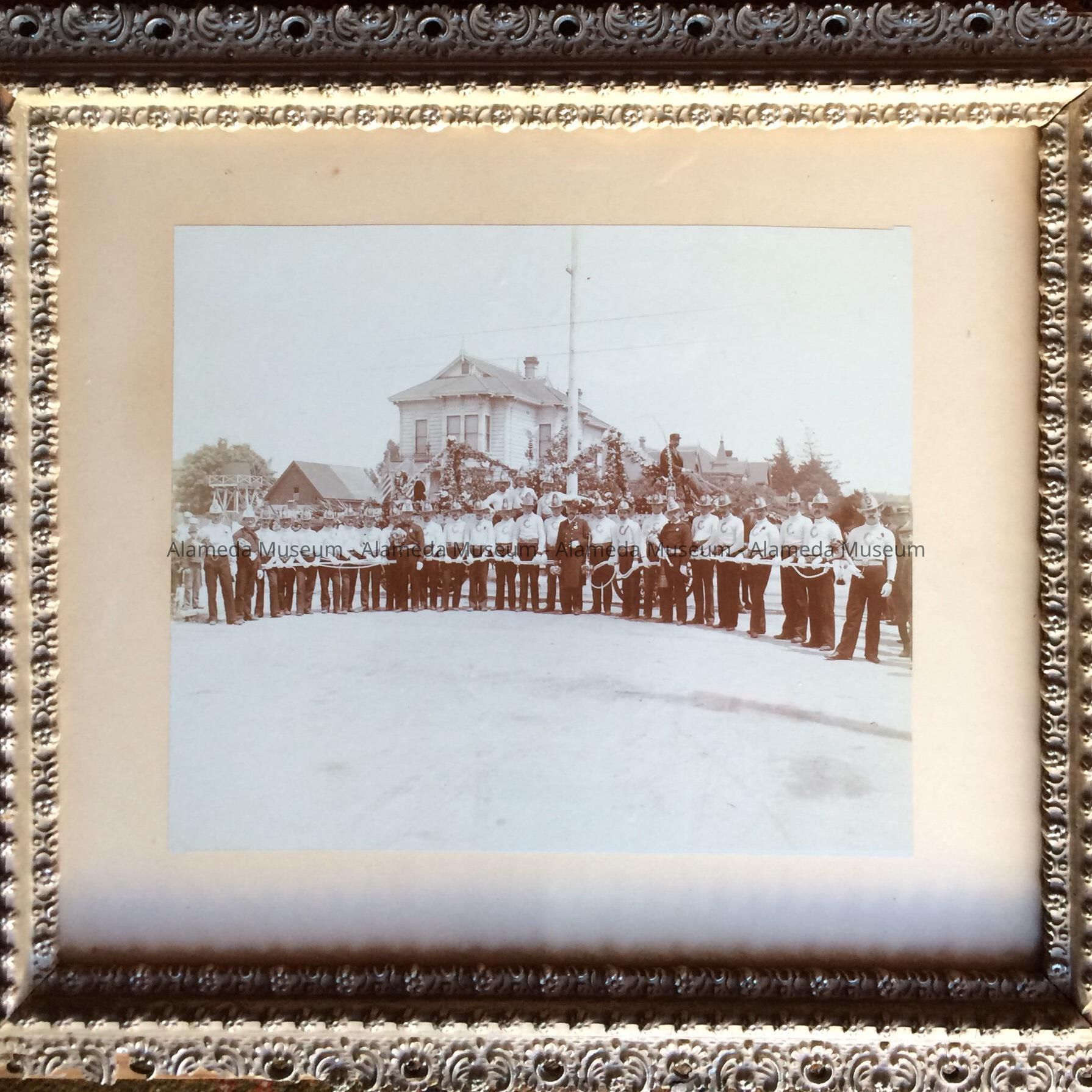 History of Object: Assembled volunteer group of the Citizens Hose Company at the laying of the cornerstone of the Alameda City Hall, May 16th, 1895. Fire Chief Fred K. Krauth is picture eleventh from the right wearing a 3/4 length coat.