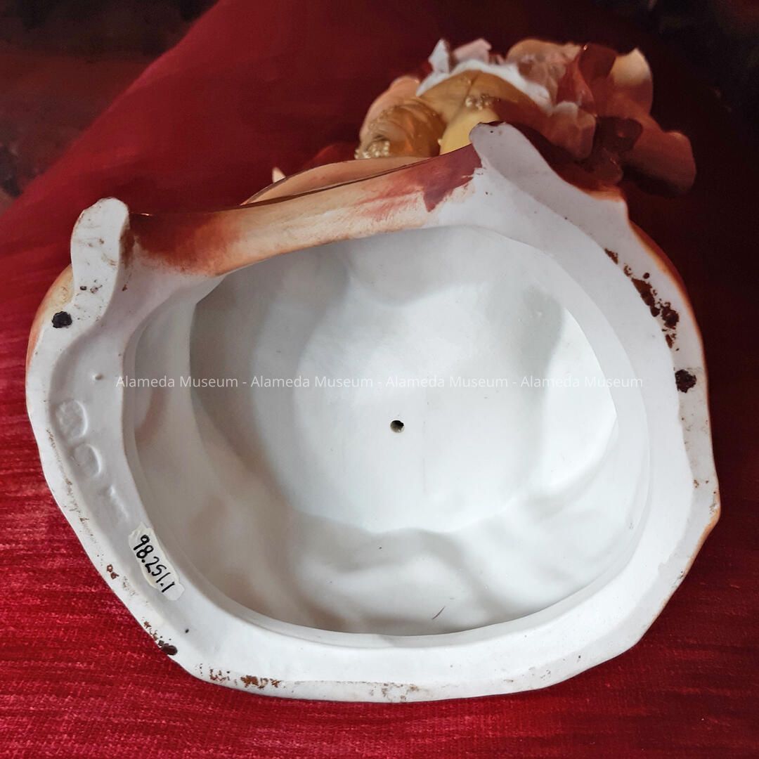FIGURINE RECEIVED BY MRS WILLIAM (MINNIE) HINDS, AS A GIFT FROM HER SON, LAURENCE J HINDS (1893-1963). HE WAS A TEENAGER AT THE TIME. LAURENCE WAS BORN IN THE FAMILY RESIDENCE AT 873 OAK STREET, ALAMEDA, CA. HE AND 4 BROTHERS WERE TAUGHT THE CARPENTER TRADE BY THEIR FATHER, WILLIAM HINDS. LAURENCE AND HIS FATHER WORKED ON THE CONSTRUCTION OF THE FIRST CHRISTIAN CHURCH, SAN JOSE AND PARK AVENUES IN THE CITY. THE FIGURINE WAS DONATED BY HIS DAUGHTER.