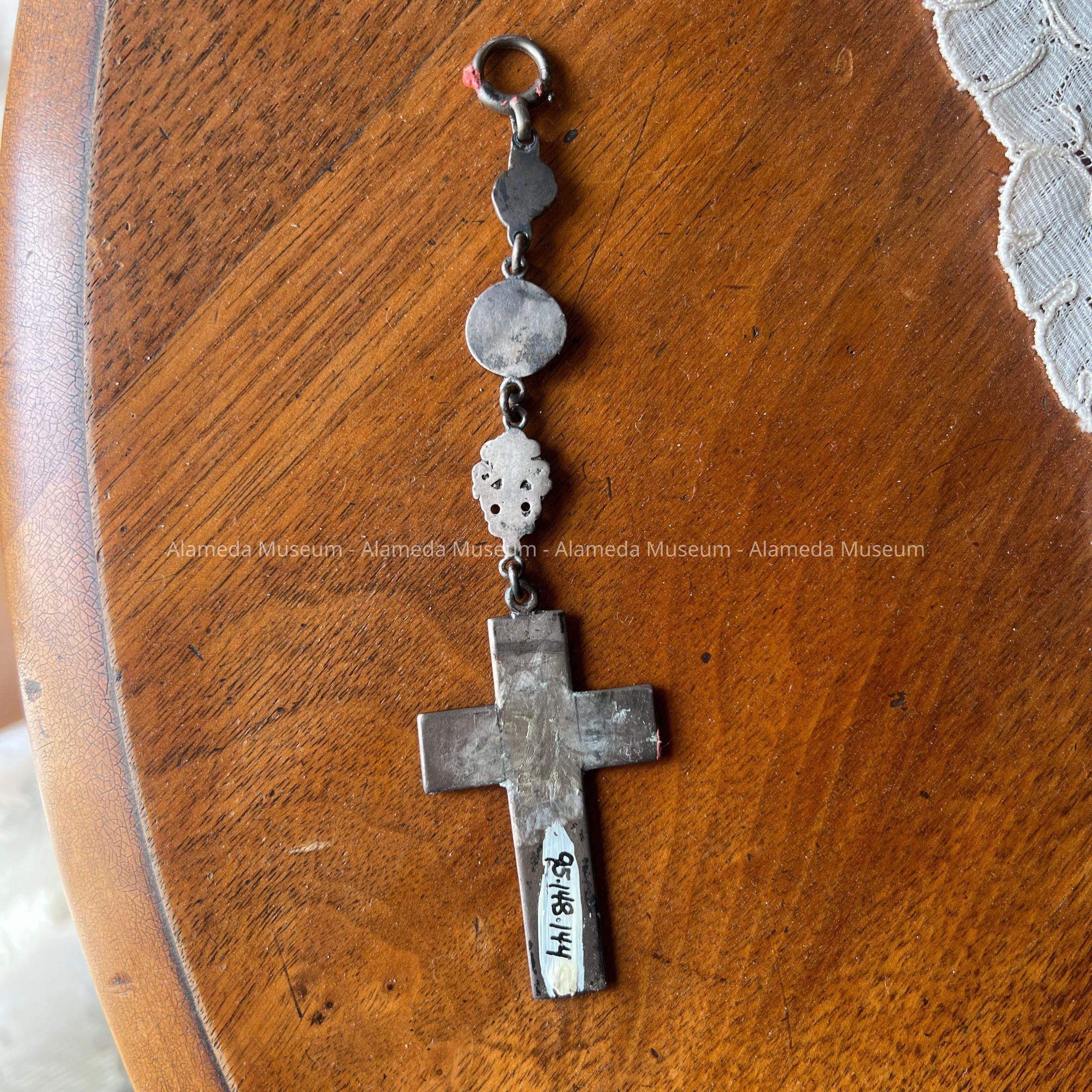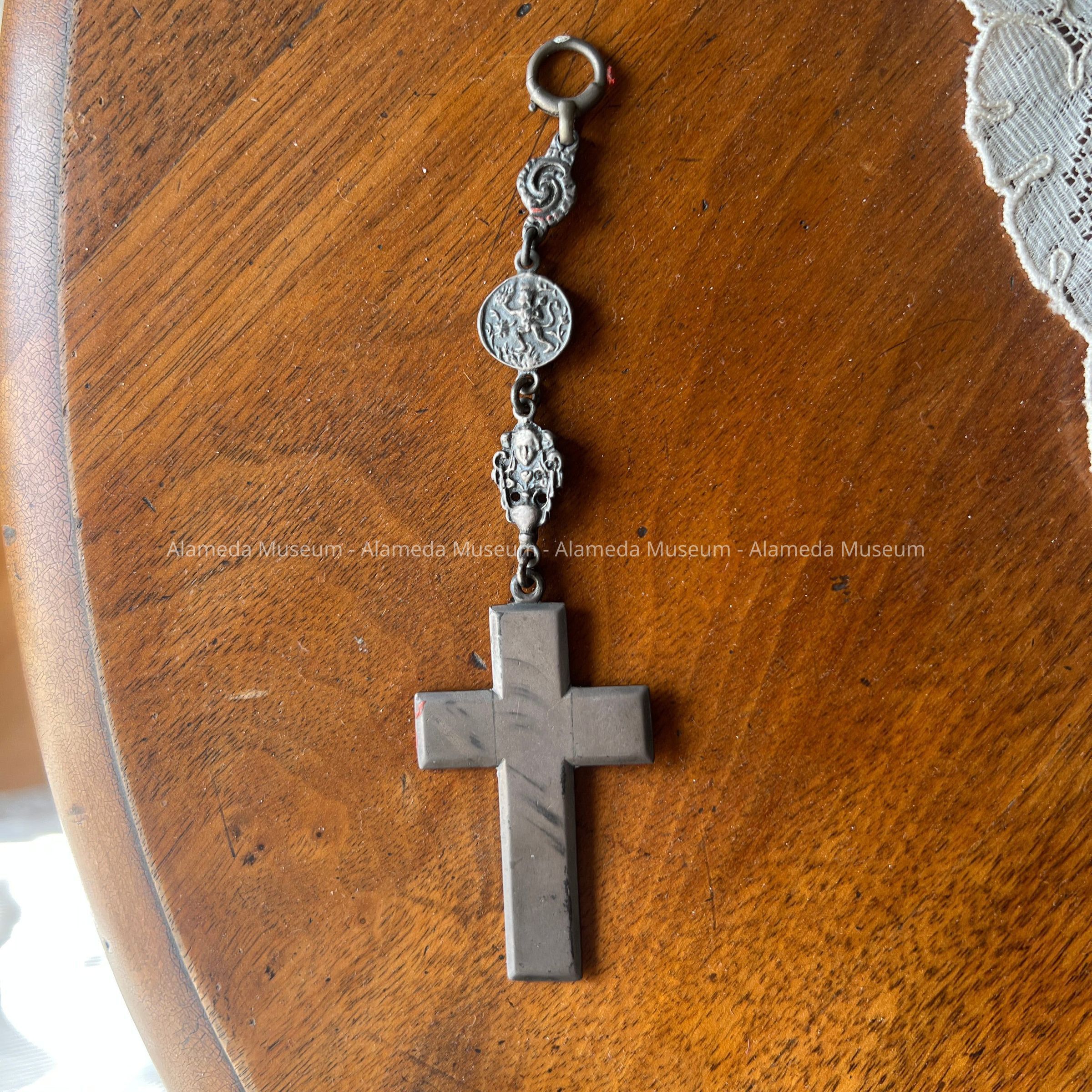 GERMAN SILVER FOB IN THE SHAPE OF A CROSS, SUPPORTED BY TWO CHAIN-LINKED MEDALLIONS. APPEARS TO BE OF EUROPEAN MANUFACTURE.