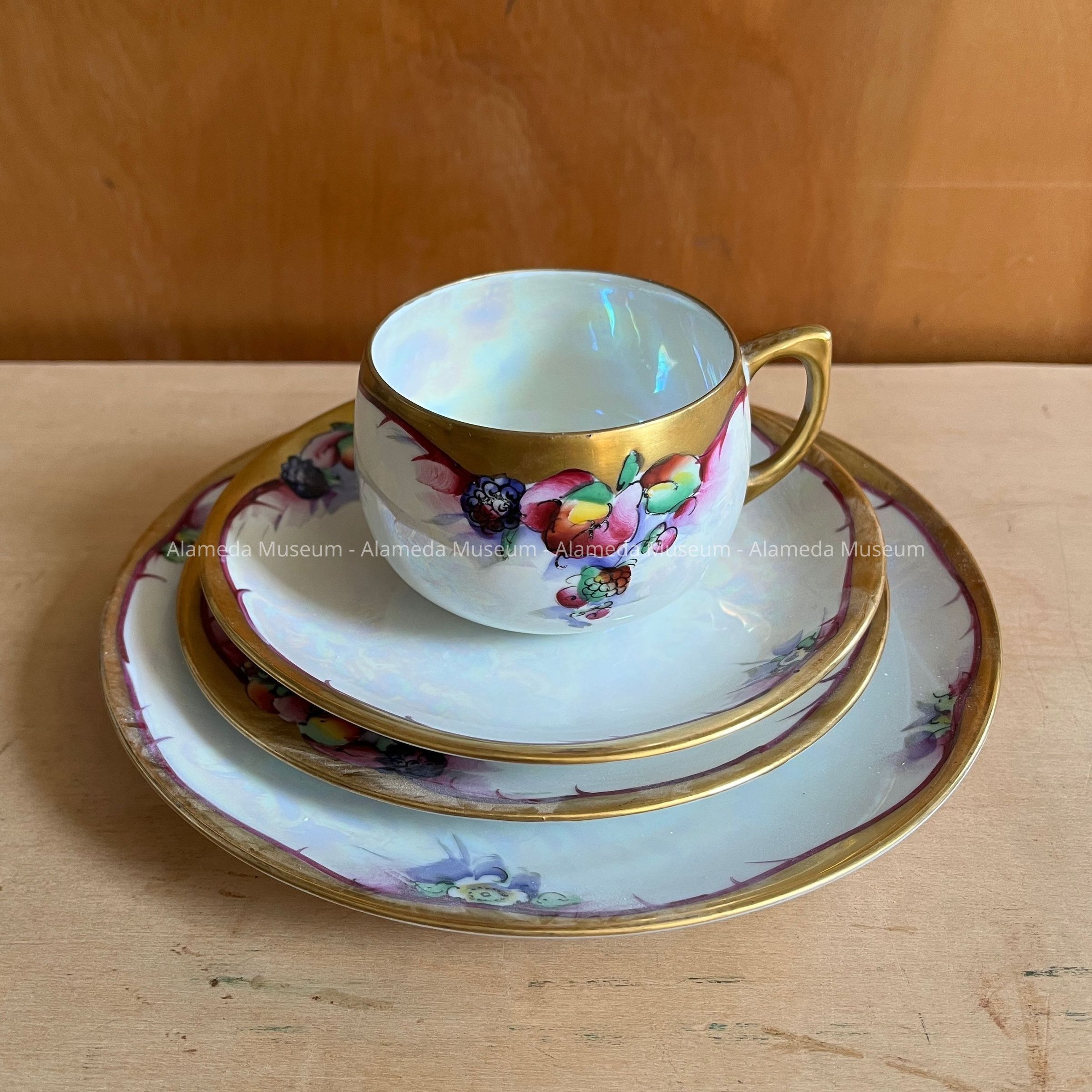 History of Object: dish set, hand-painted by Alameda-based China-painter Thomas Jorgensen (1879-1943). This set is a good example of the same design was implemented on materials from different manufacturers.