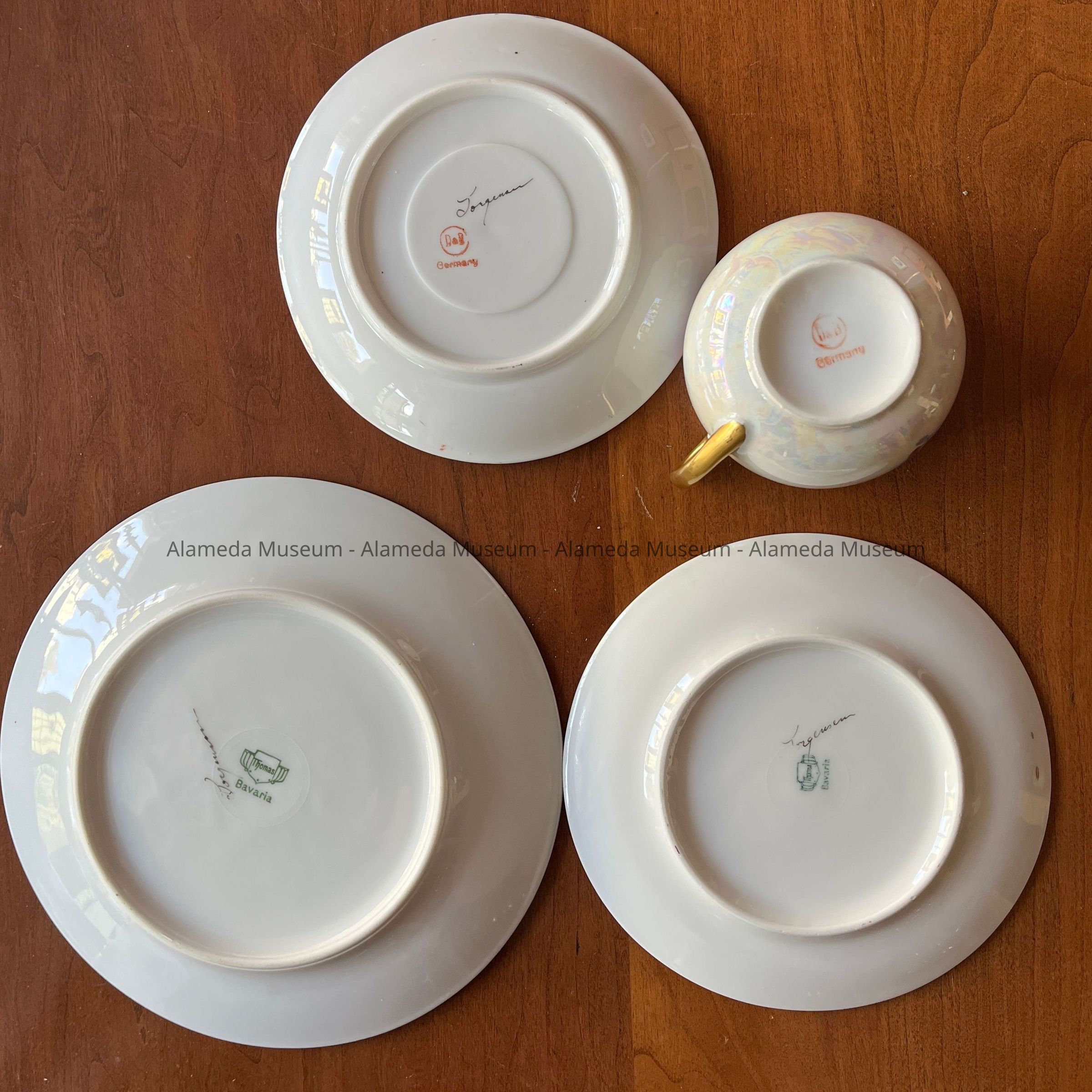 Description: a china dish set consisting of A, breakfast plate; B, small plate; C, saucer; D, cup, of German porcelain, hand-painted with a design of fruit on a luster-base, and accented with gold on the rims and cup handle. Plates and saucer are signed at the bottom, ‘Jorgensen’. Cup and saucer have a red manufacturer’s stamp ‘D & ẞ Germany’, plates have a green stamp ‘Thomas Bavaria’.