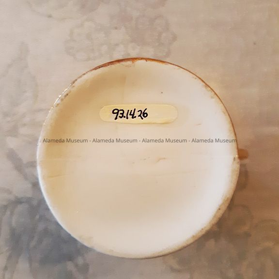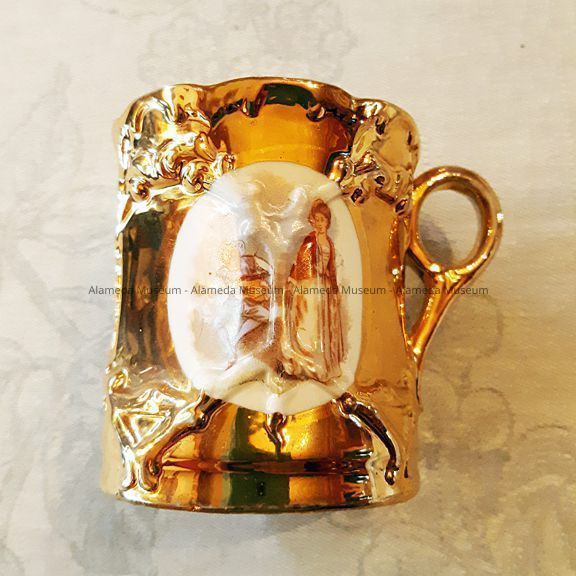 History of Object: Decorative mug that belonged to Mr. & Mrs. Wm. Cox Sr., parents of Wm. Cox Jr., husband of Adeline T. Cox. The Cox family have been known to be residents of Alameda as early as 1914.