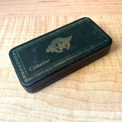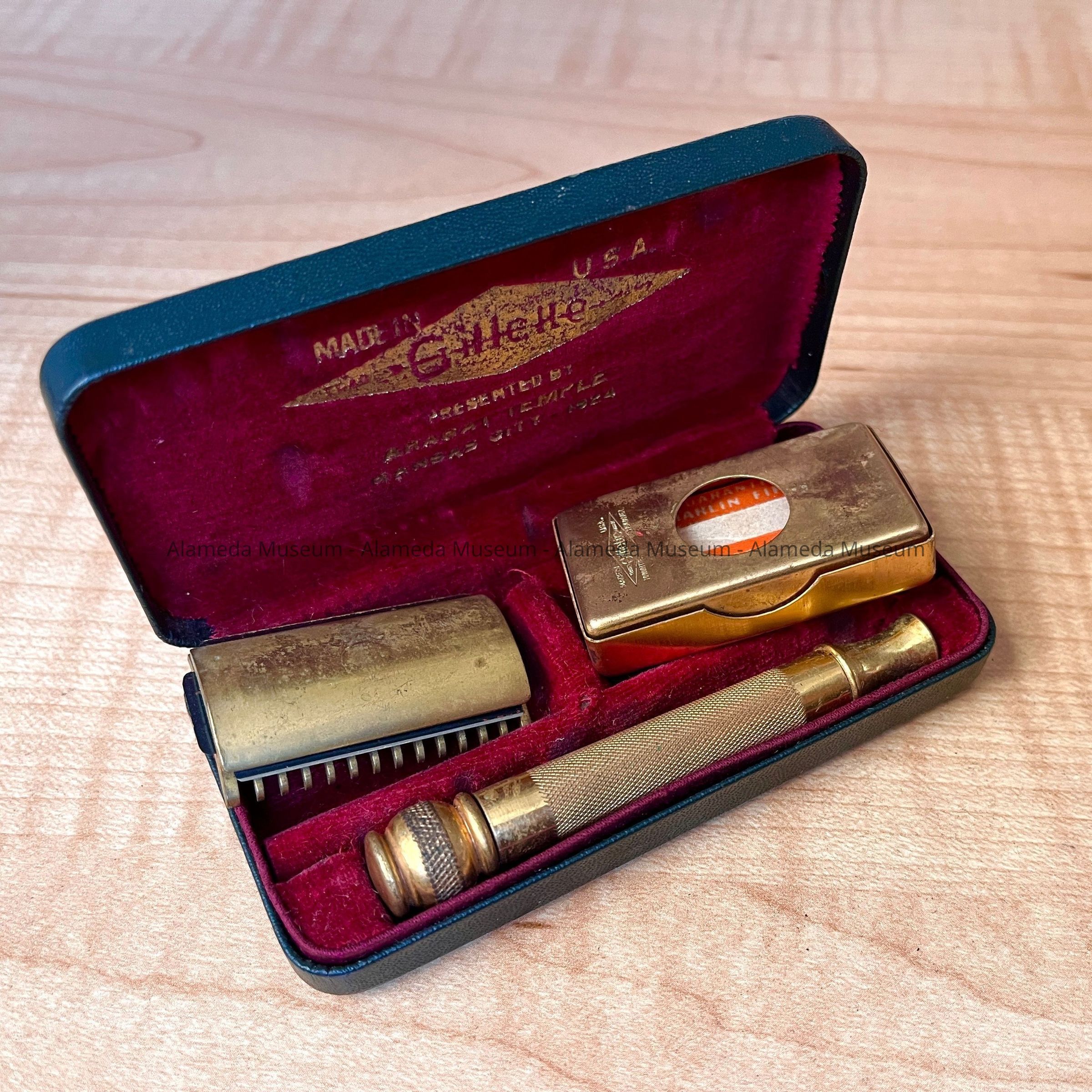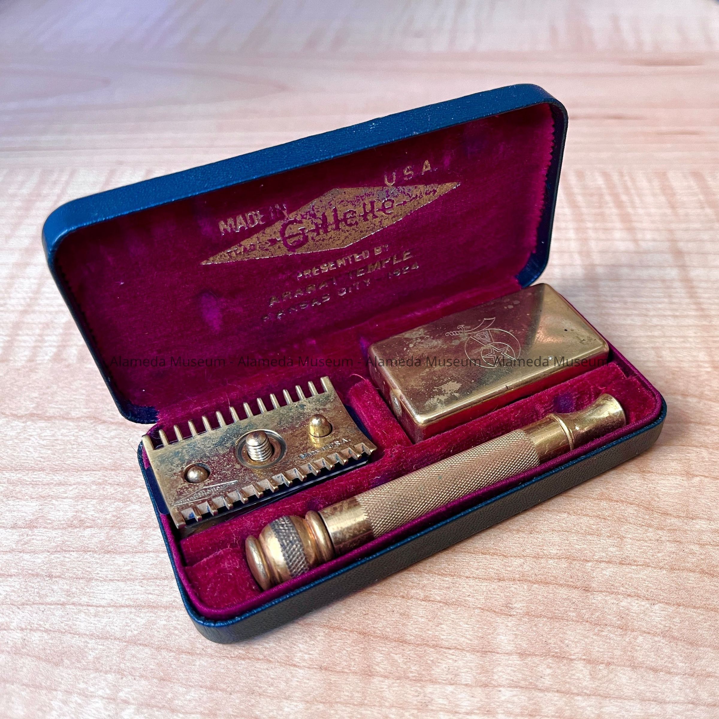 OBLONG-SHAPED RAZOR CASE COVERED IN IMITATION BLACKCOLORED LEATHER. COVER HAS SHRINERS' EMBLEM IN GOLD COLORED TYPE AND THE CAPTION, "GILLETTE." INTERIOR OF CASE IS LINED WITH RED-COLORED VELVET AND HOUSES A GOLD PLATED DETACHABLE RAZOR AND BLADE HOLDER.