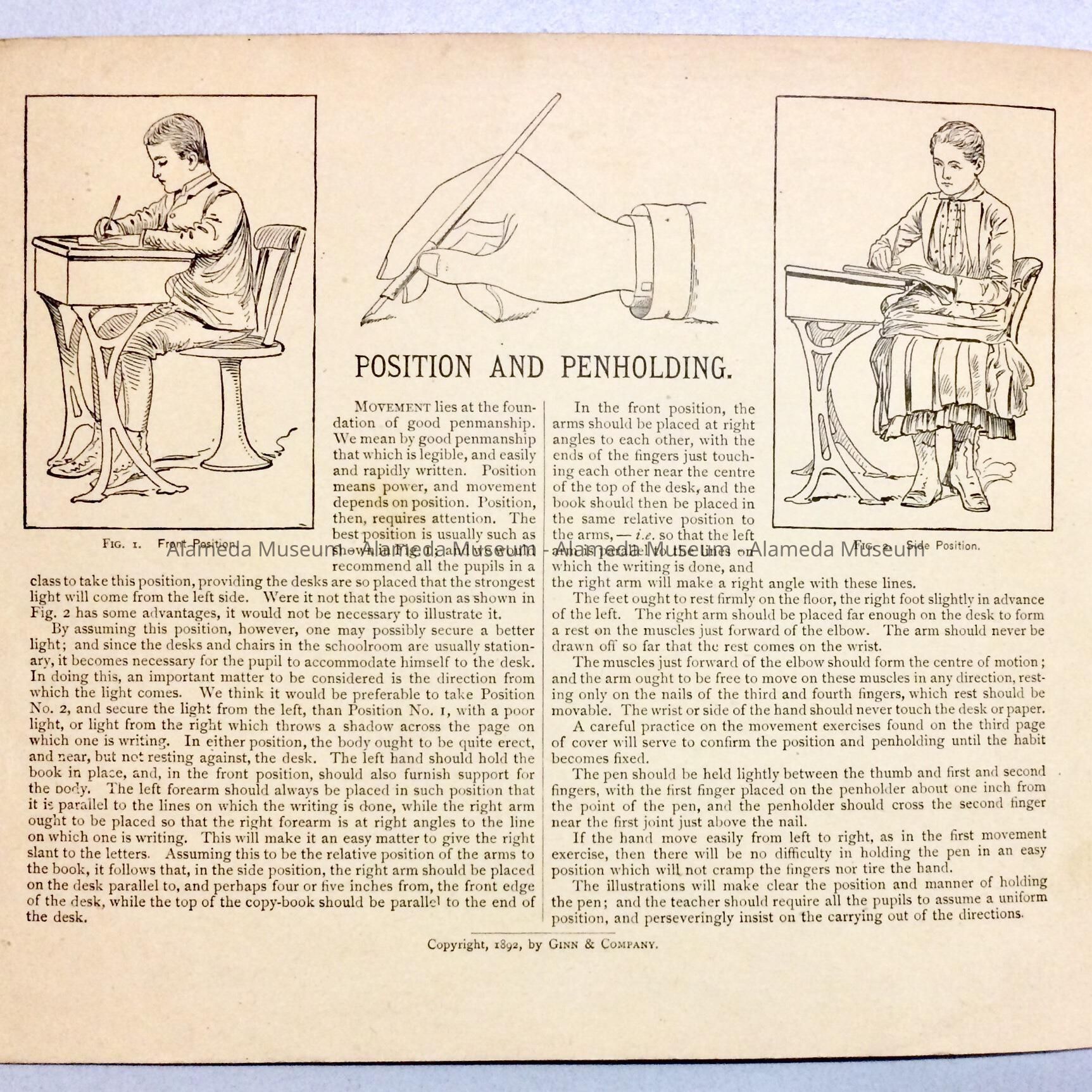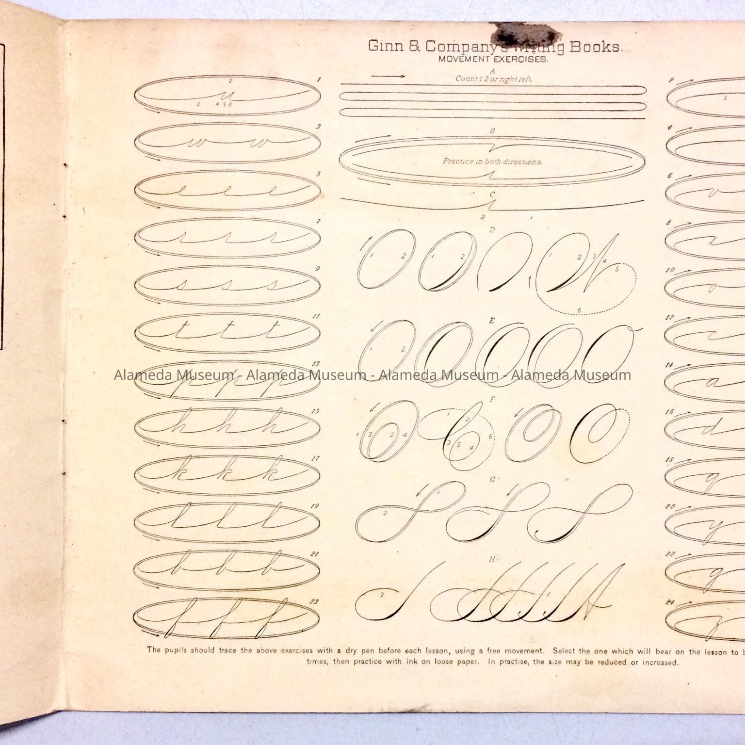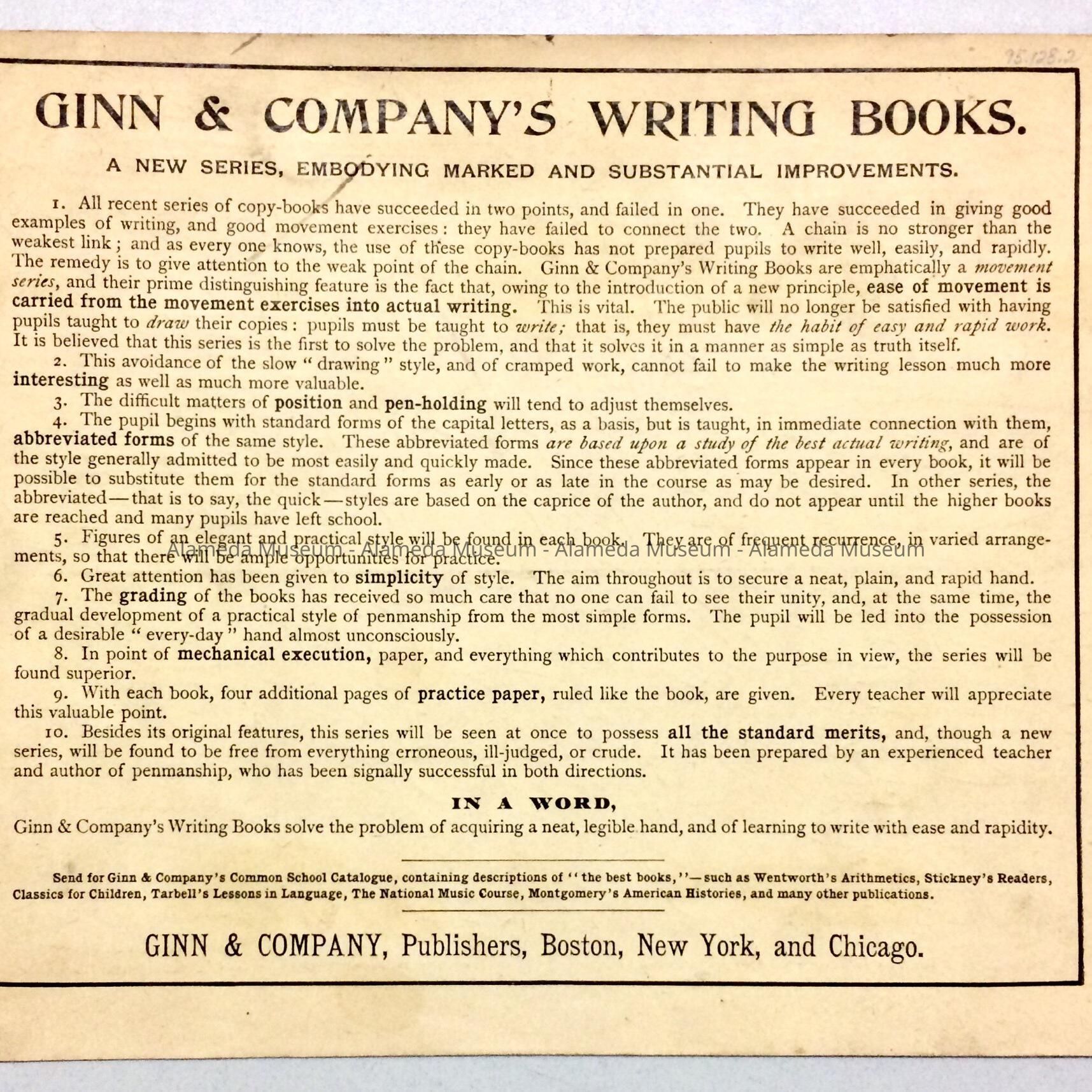 Description: Two-page booklet printed on heavy stock paper. Bold printed caption in black-colored type "Ginn & Co.'s Writing Book." Interior has instructions in writing and examples in script.