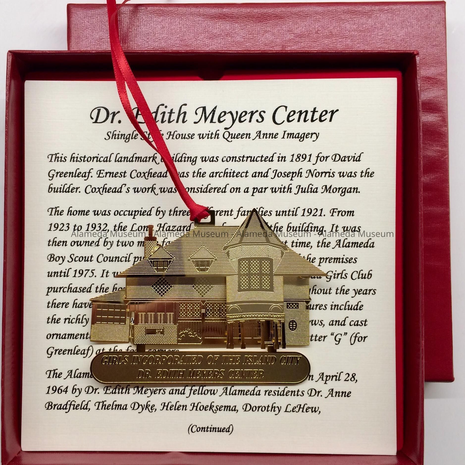 History of Subject: ornament in the shape of the silhouette of the Girls Inc. Club House, the Dr. Edith Meyers Center, at 1724 Santa Clara, with informational sheet with the history of the building and organization. Text mentions Facebook, a company created in 2004.