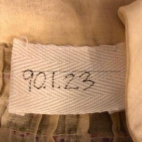 History of Object: Girl's dress with hand-blocked print by the artist Maude F. Baker (Mrs. Russell P.), of Alameda. The dress was created for her daughter, Barbara Baker (born Alameda-1916).