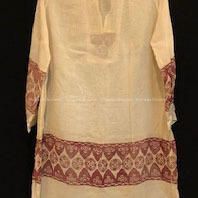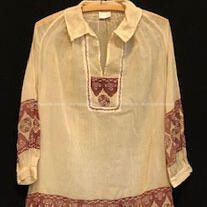Description: Sheath dress of off-white voile material with hand blocked designs (art-deco) in red on sleeves, bodice, and lower skirt.
