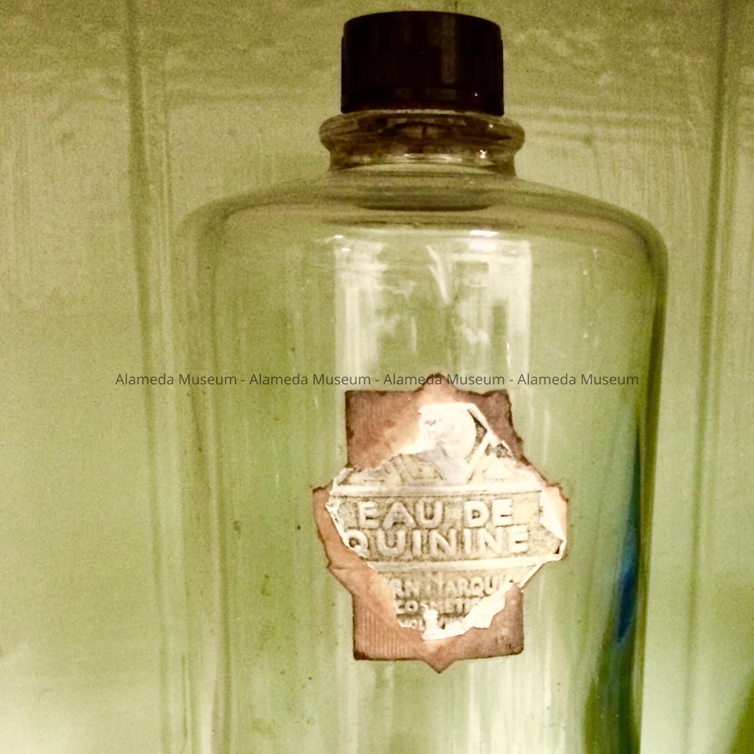 CLEAR GLASS BOTTLE, WITH PAPER LABEL STATING "EAU DE QUININE,." BLACK-COLORED PLASTIC SCREW TOP.