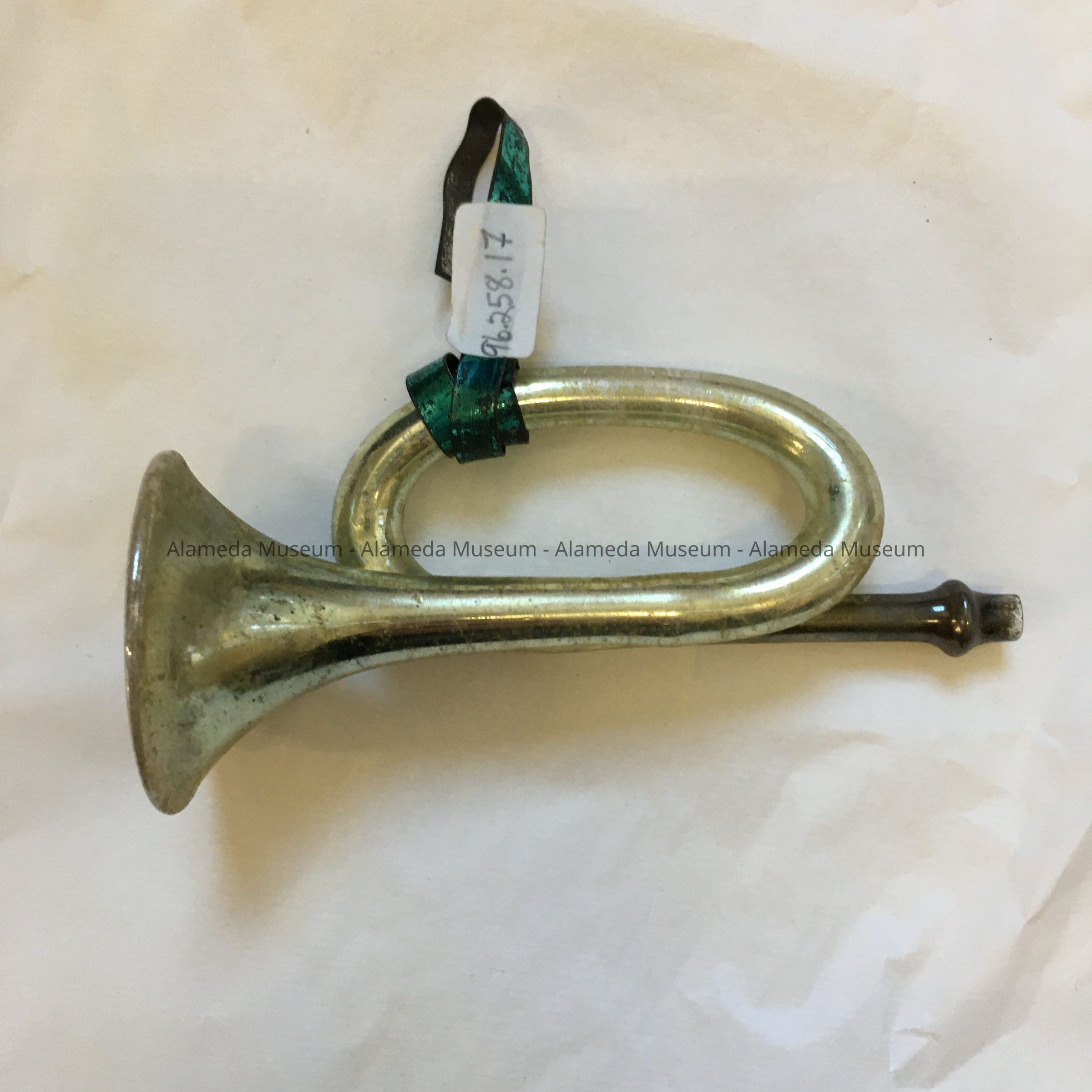 GLASS CHRISTMAS ORNAMENT IN THE SHAPE OF A TRUMMPET, WITH INTERIOR OF SILVER OR MERCURY GLASS.