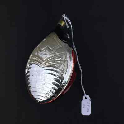 Description: glass ornament in the shape of a ladybug, with silver underside, 7 black dots on red shields, and black head. Some of the black paint has chipped off the head.