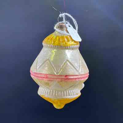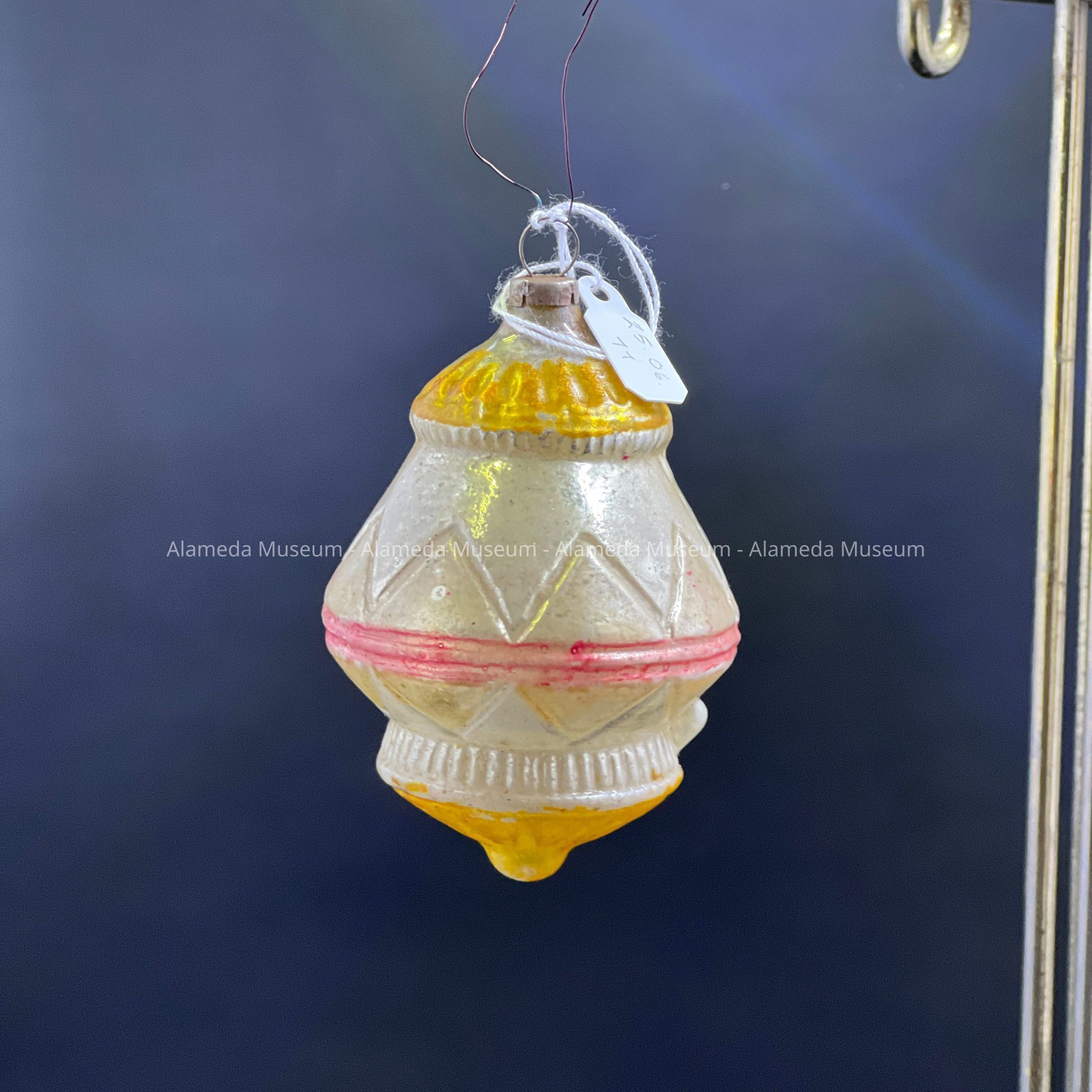 Description: Made with mercury, this turn-of-the-century ornament has a lot of discoloration from age and use. Made with a possible silver or white background, there is yellow and pink paint to go around the middle, top, and bottom of the ornament.