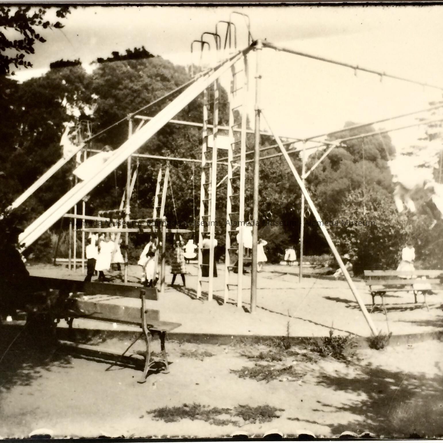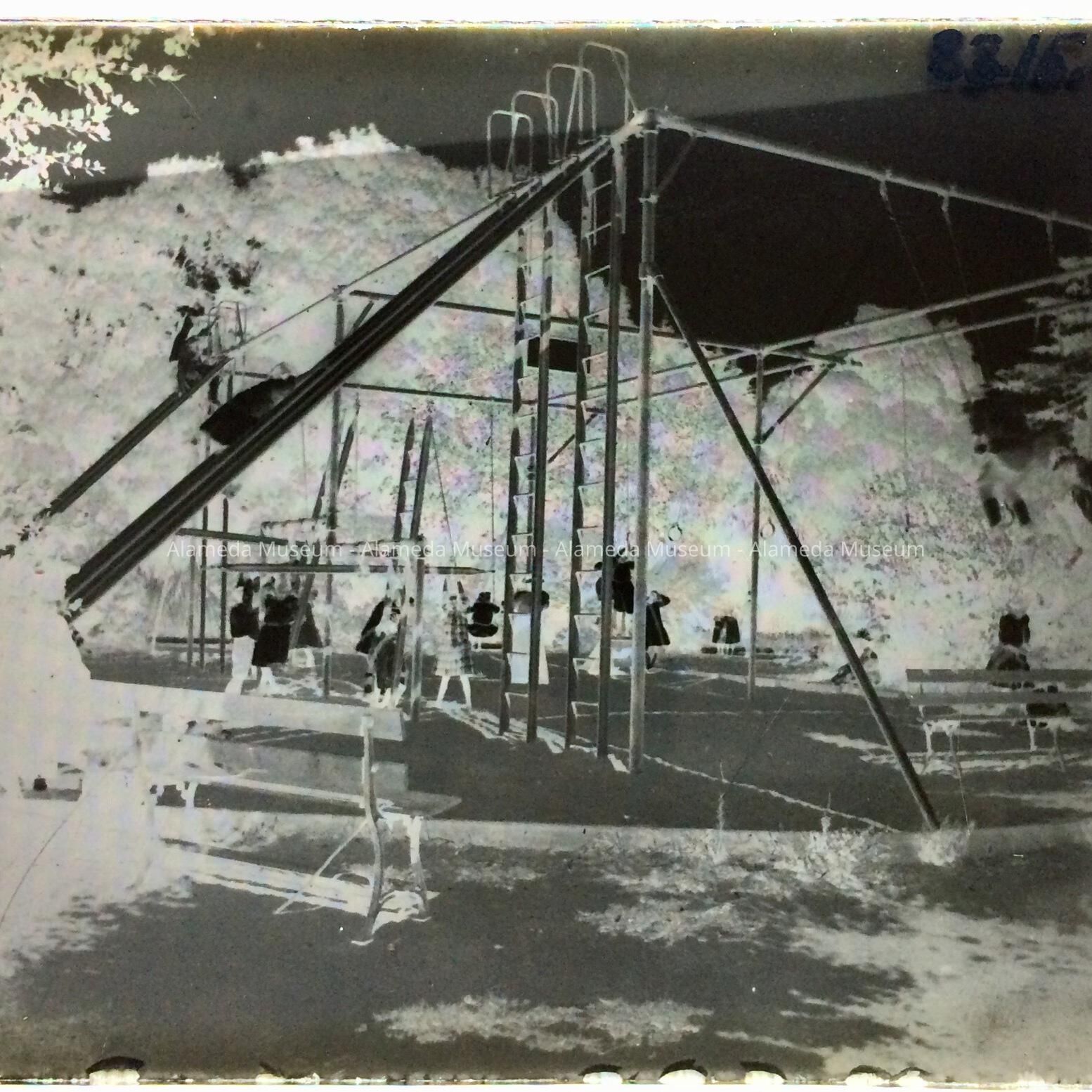 History of Object: Glass negative and contact print depicting children at play on swings and slides, Lincoln Park, circa 1910.