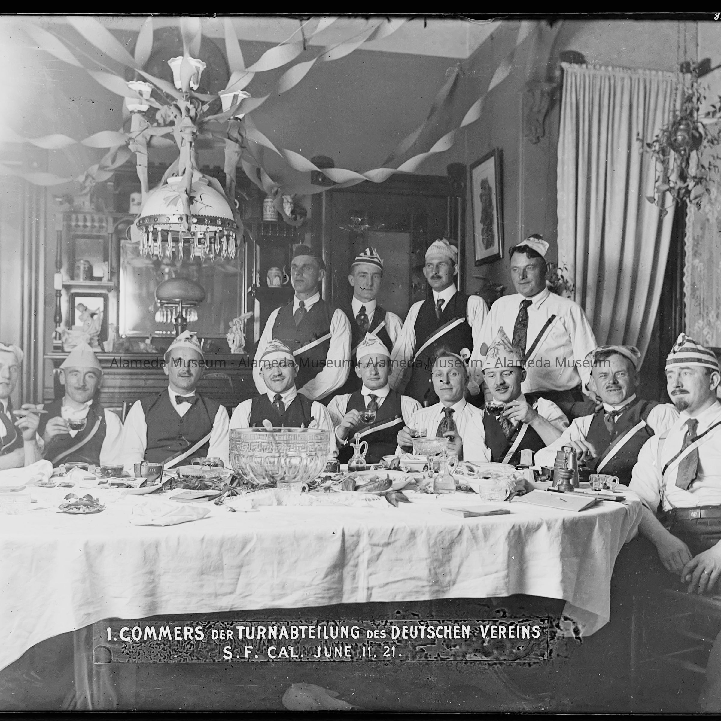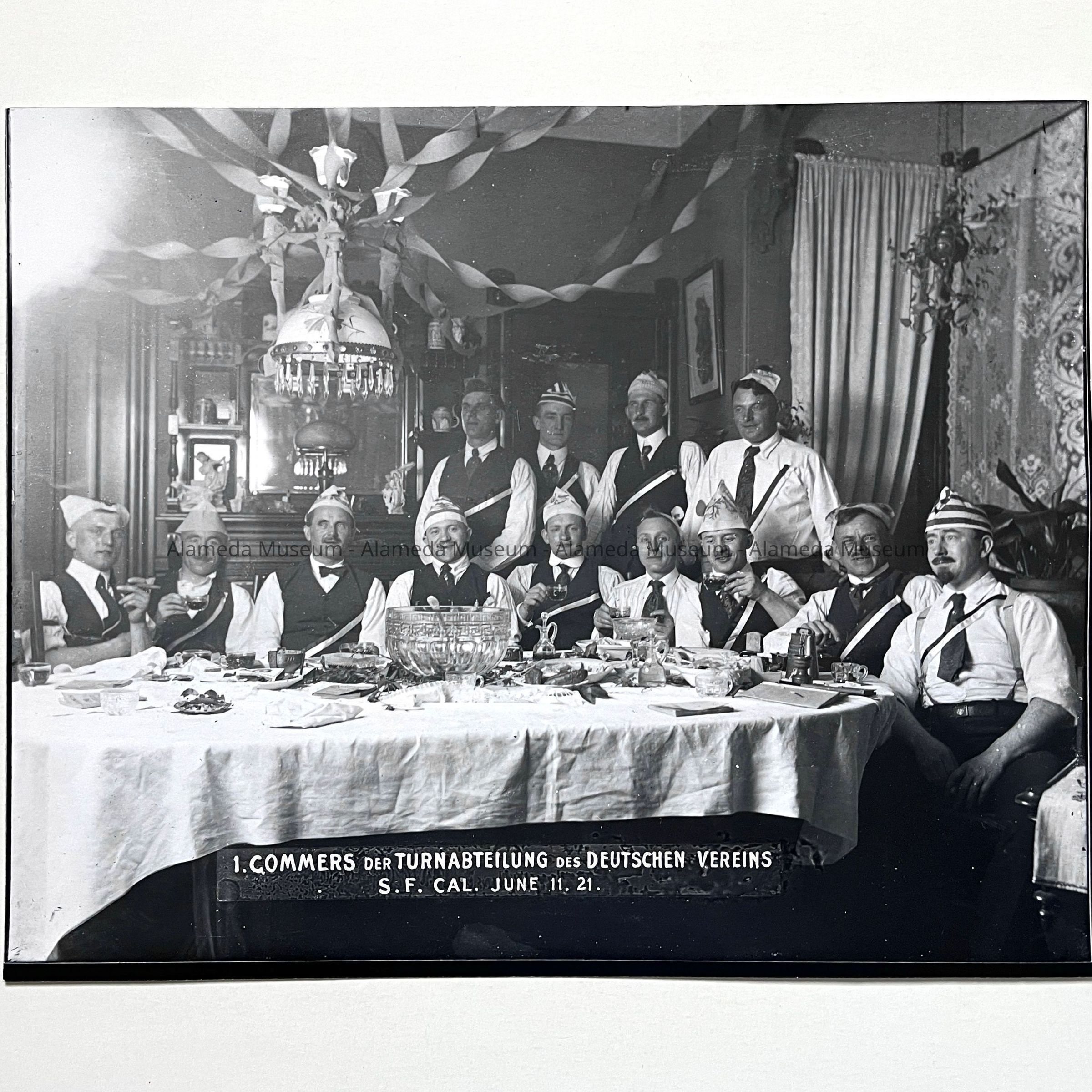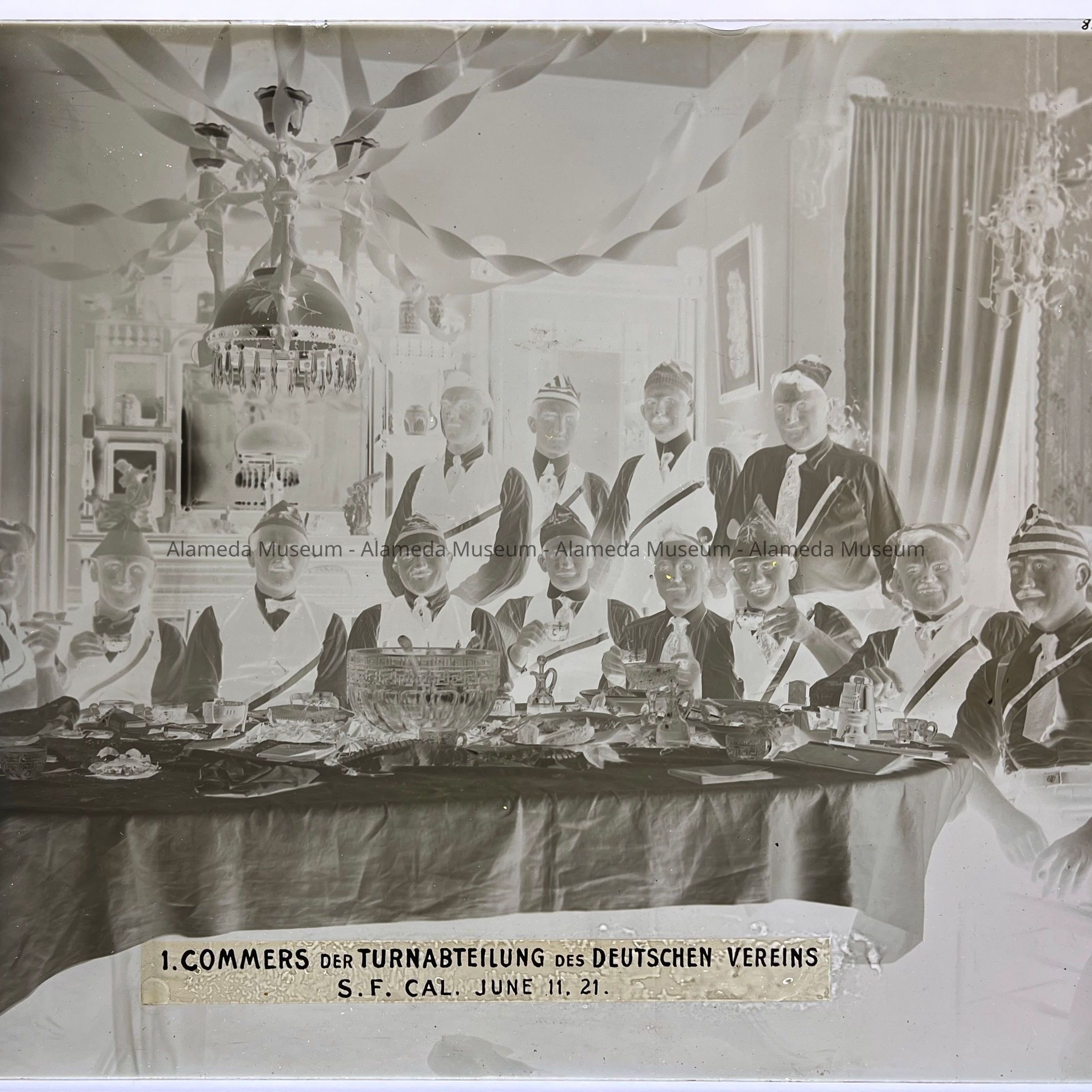 Photo negative of a German gymnastic club party held in the dining room of 1523 Mozart Street (Busse home), Alameda, 1921.