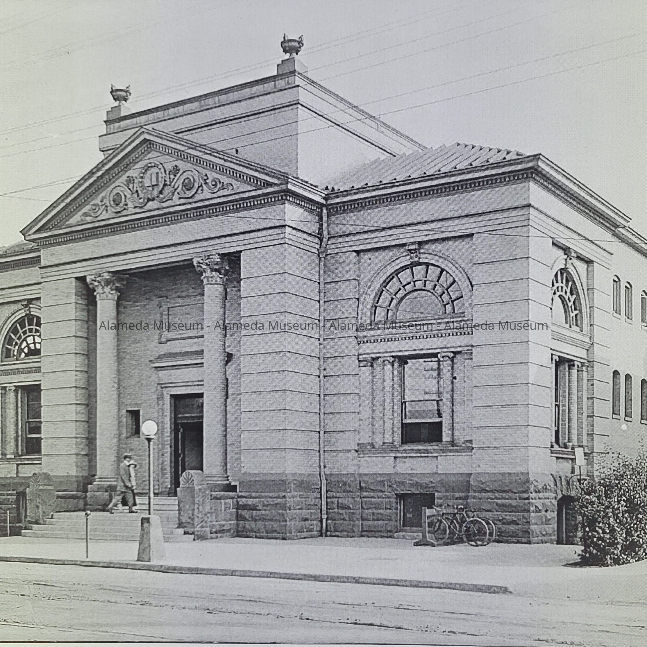 This building was built in 1902, C. H. Foster and sons architects. Though no longer the alameda Library, the building still exists with almost no alterations. The negative has a photographer's studio logo and the number C-1303 in the lower left hand corner. When purchased by the donor, the seller attributed the photo to the Cheney Photo Advertising Co.