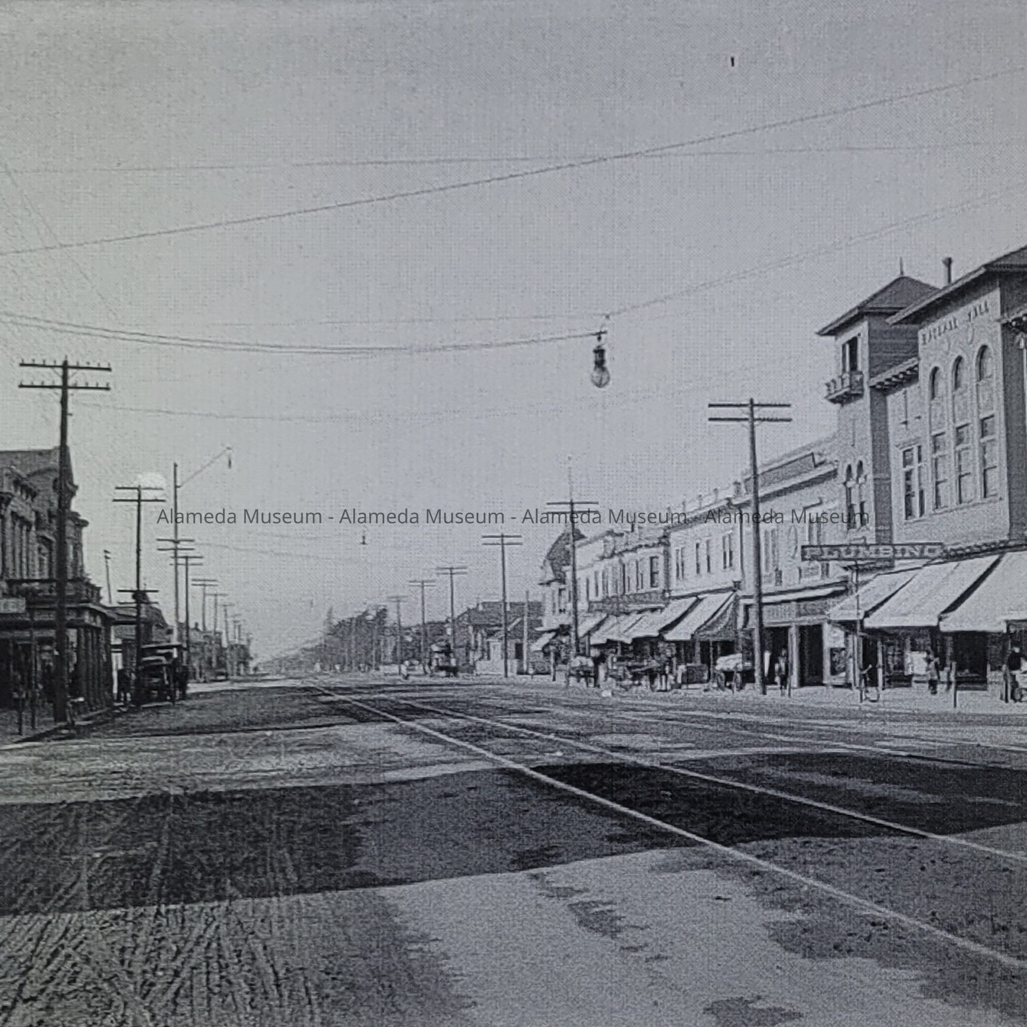 This negative shows a rare image of Encinal Hall. Lincoln Ave is not paved and two sets of railroad tracks can be seen. Bicycles and horse-drawn transportation is visible. No cars are shown.