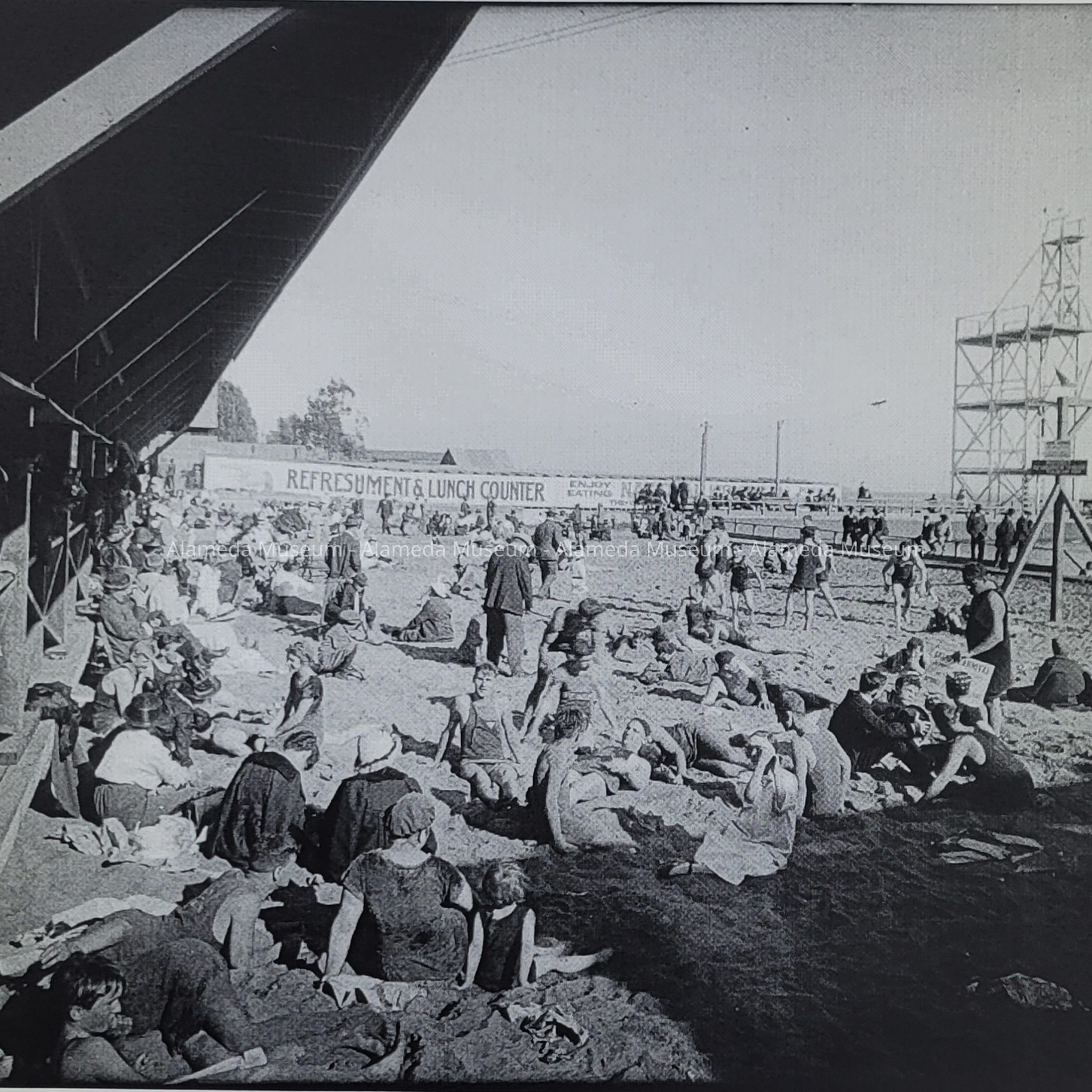 This photo was take before Neptune Beach existed. In 1916, the Safety Racer was constructed on the other side of the wall seen in the background as part of the New Surf Beach. That defunct park was replaced by Neptune Beach in 1917.