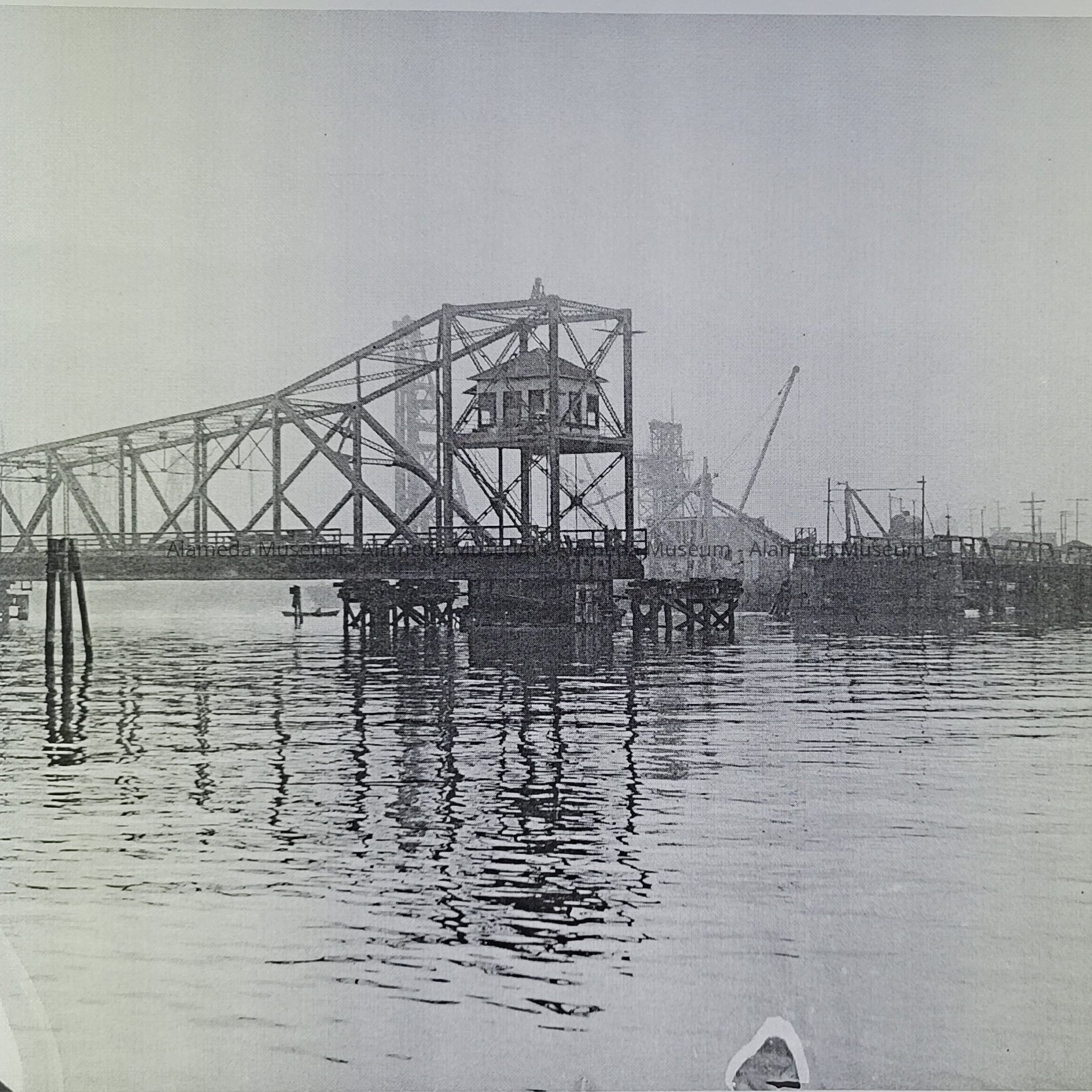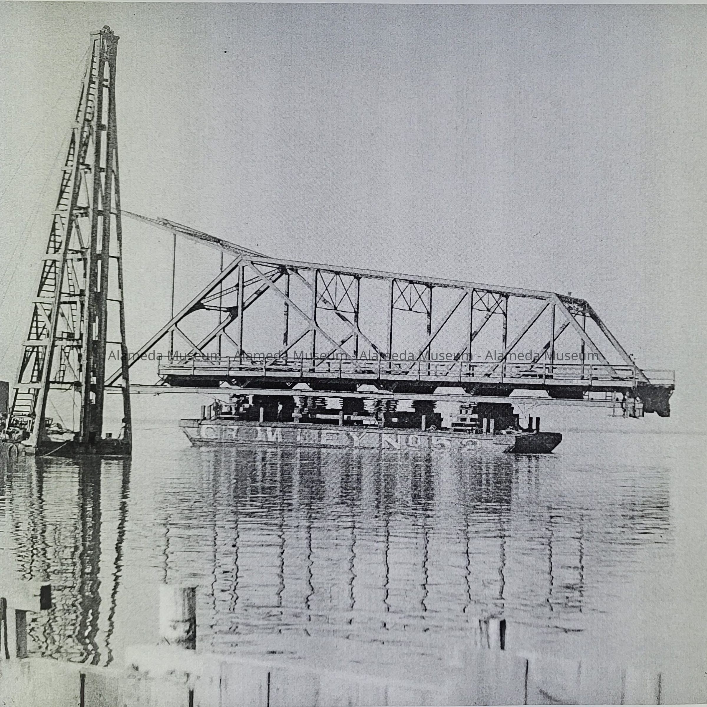 2024.71.1B is a glass plate negative, showing the south side of the Webster St bridge on a barge. The information provided with the negative said it was on its way to Antioch.