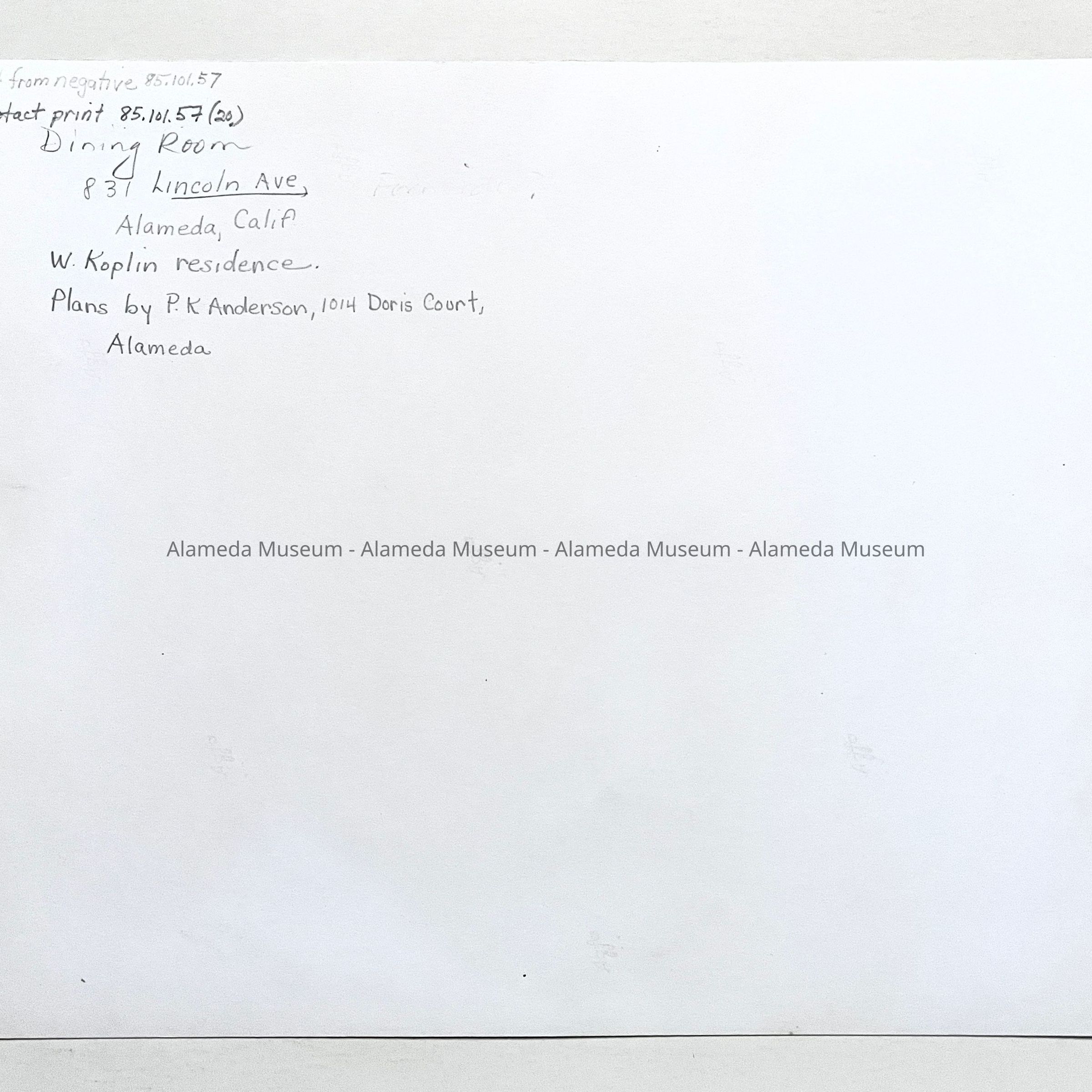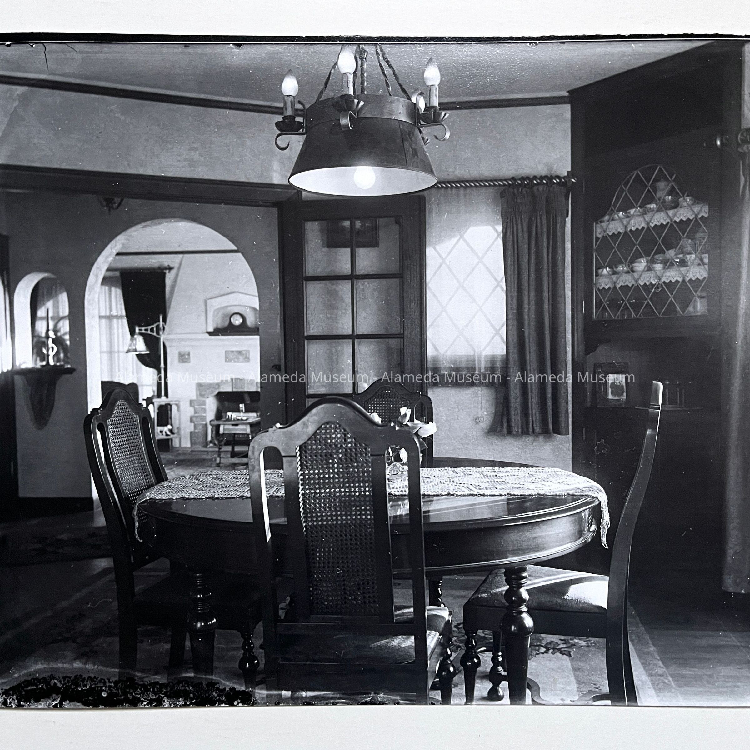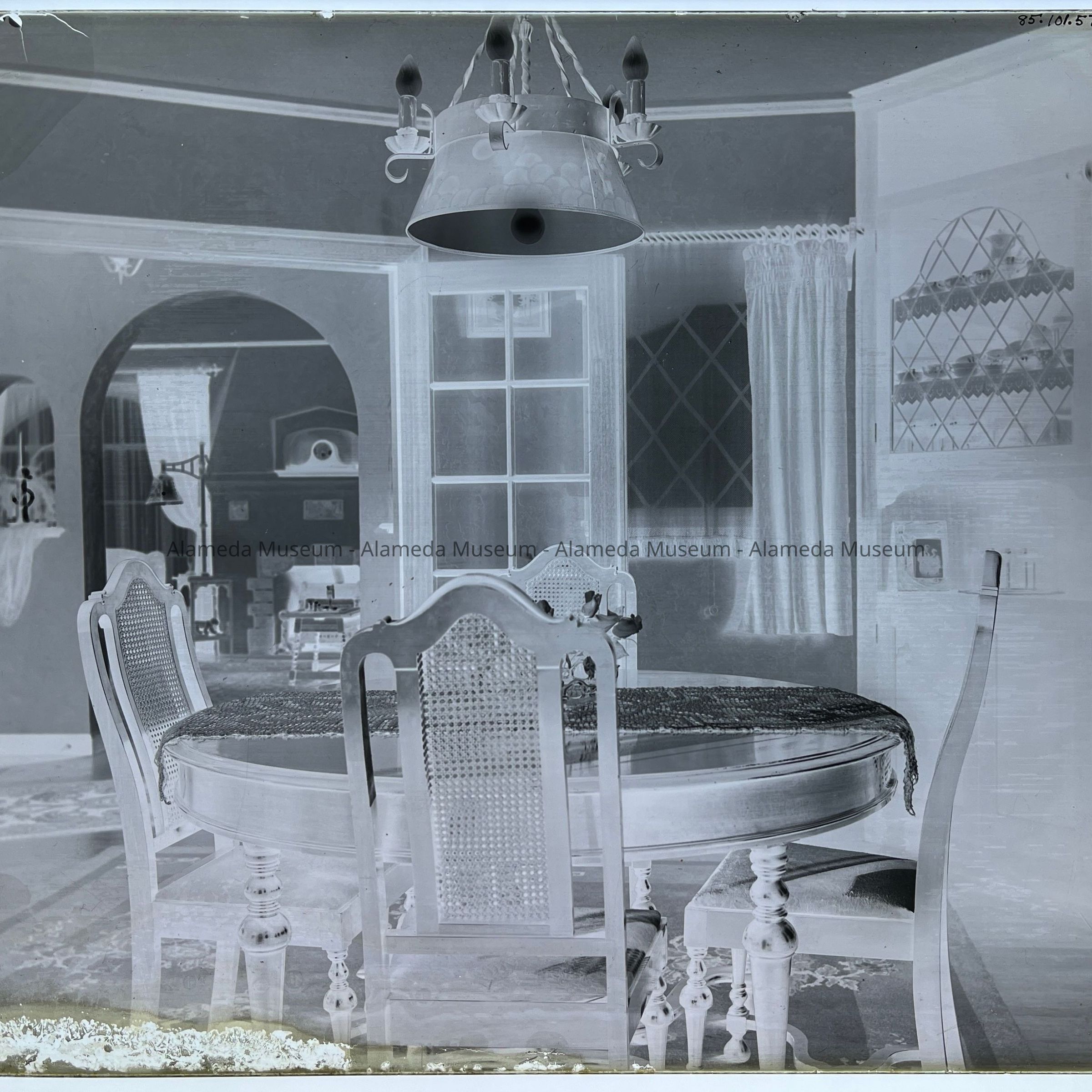History of Object: Photo negative depicting the dining room of the W. Koplin residence, 831 Lincoln Avenue, Alameda. Plans by P. K. Anderson, 1014 Doris Court, Alameda. Photographed shortly after its completion.