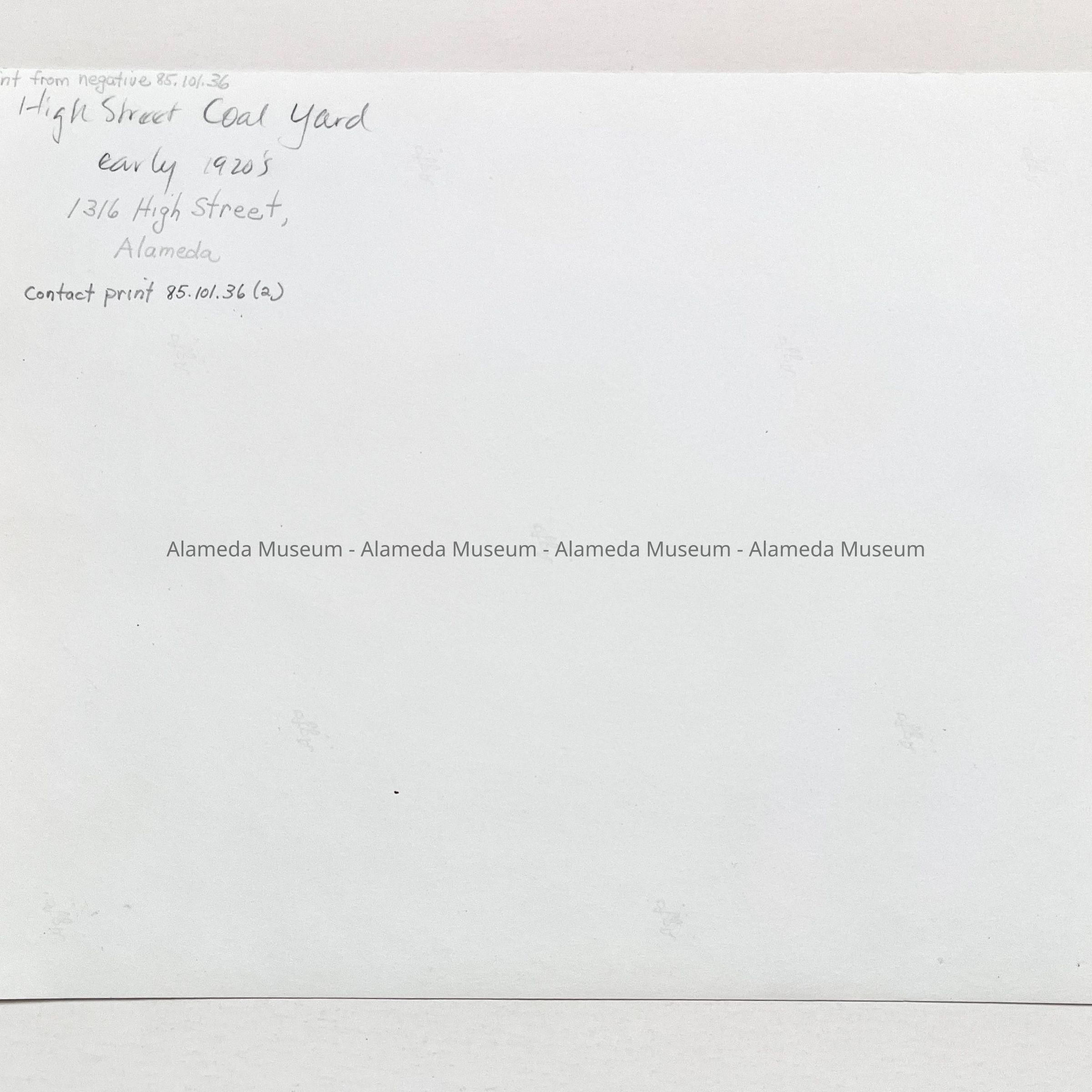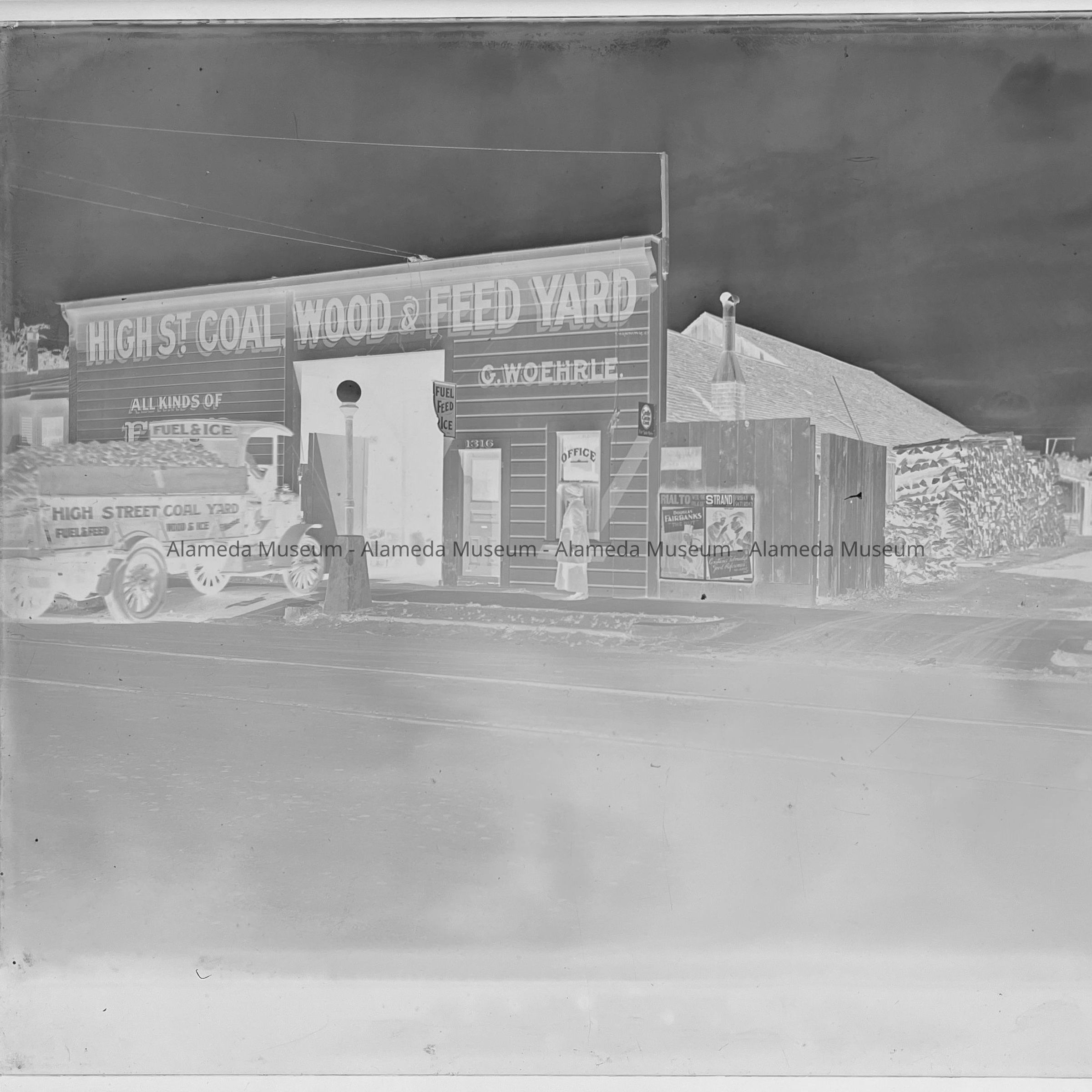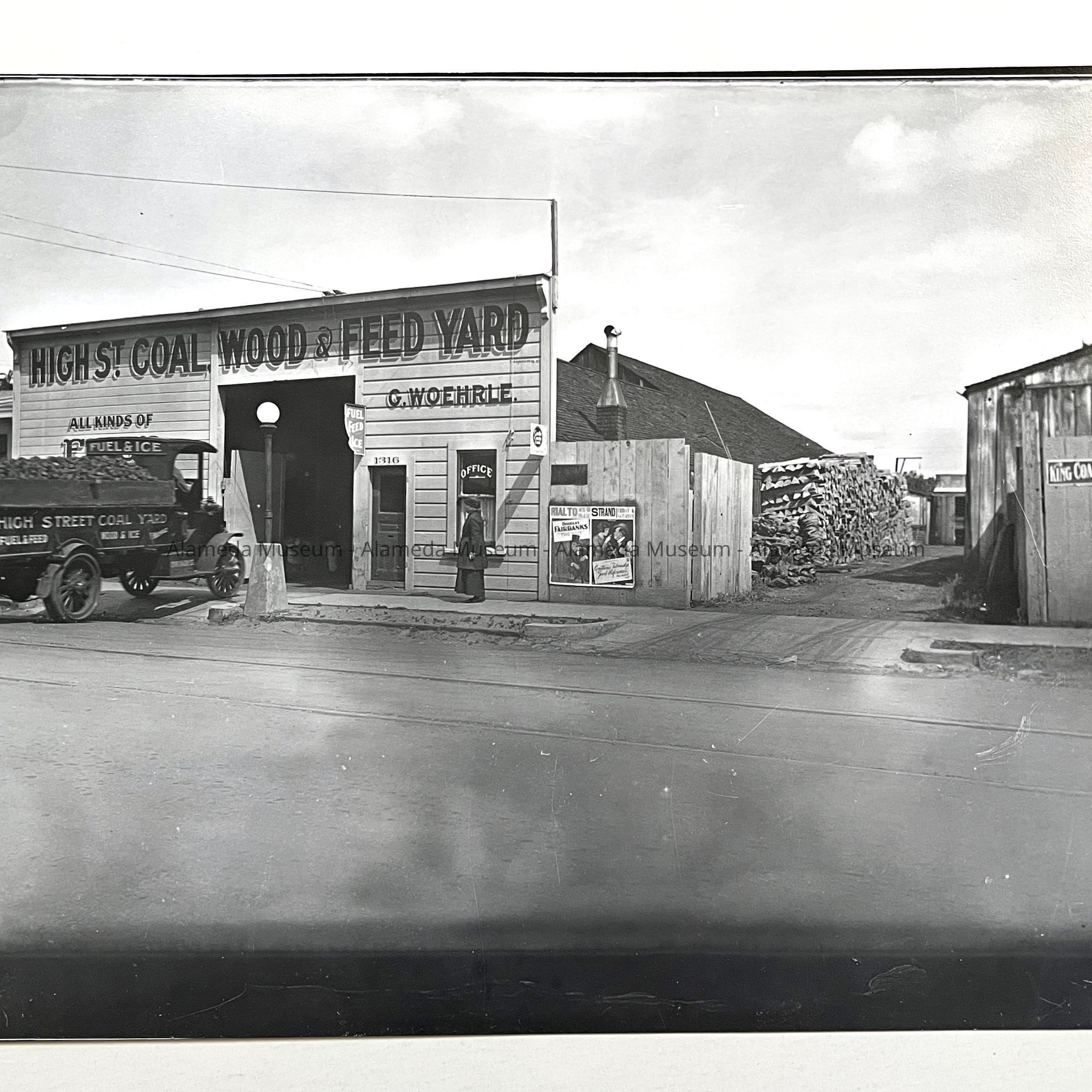 History of Object: Photo negative of the exterior of the High Street Coal, Wood & Feed Yard, 1316 High Street, G. Woehrle, proprietor.