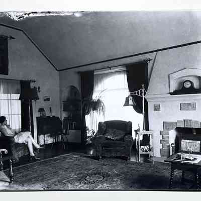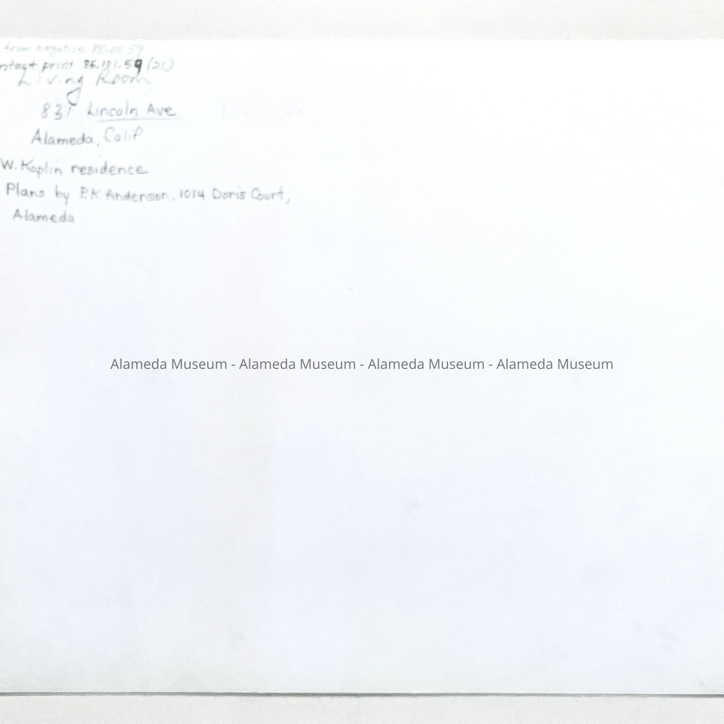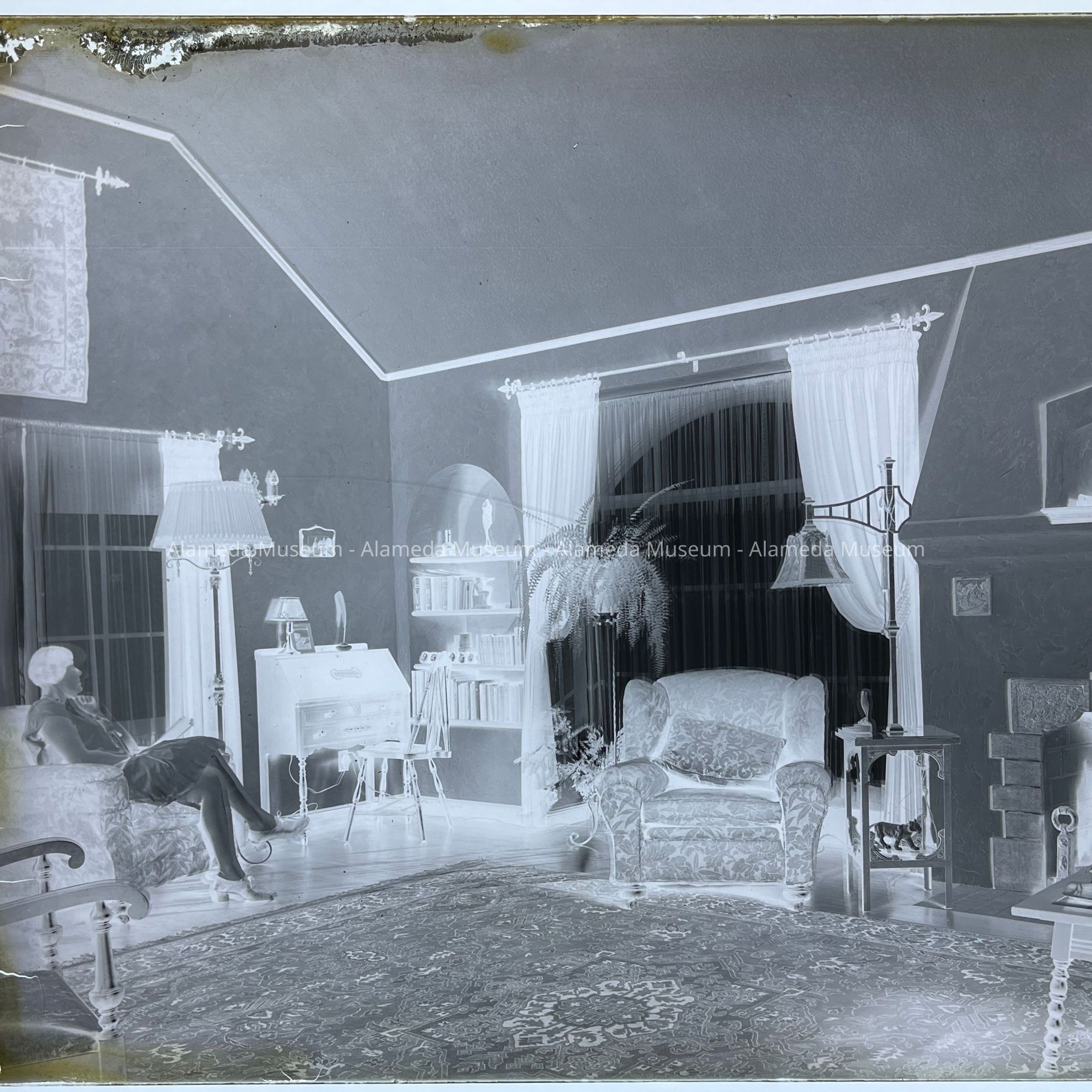 History of Object: Photo negative depicting the living room of the W. Koplin residence, 831 Lincoln Avenue, Alameda. Plans by P. K. Anderson, 1014 Doris Court, Alameda. Photographed shortly after its completion.