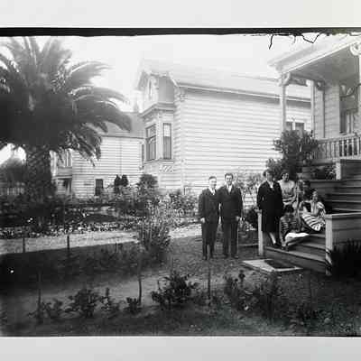 Glass plate photo negative Mrs. Busse family members and friends in front of 1523 Mozart Street, 1929-1930Entry/Object ID