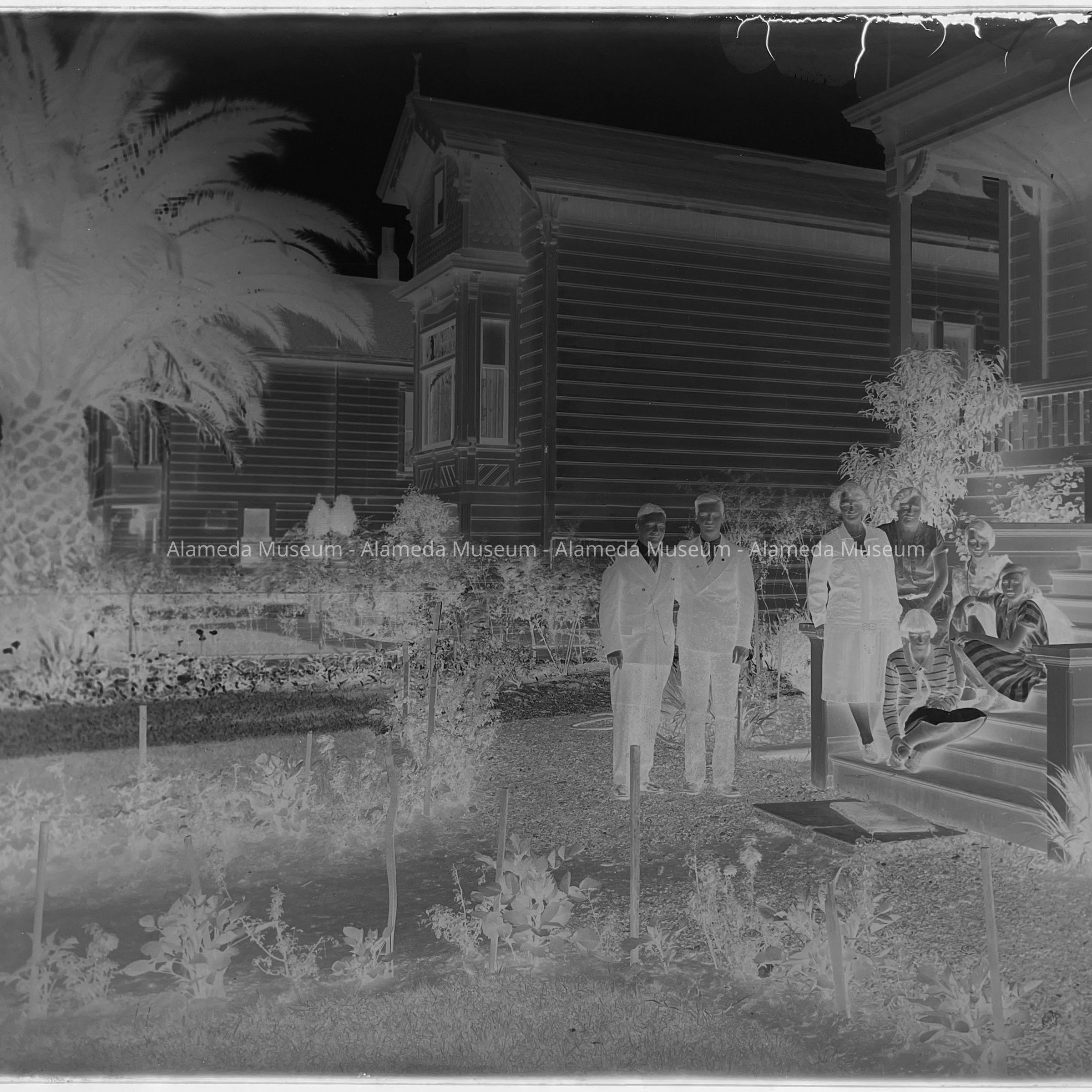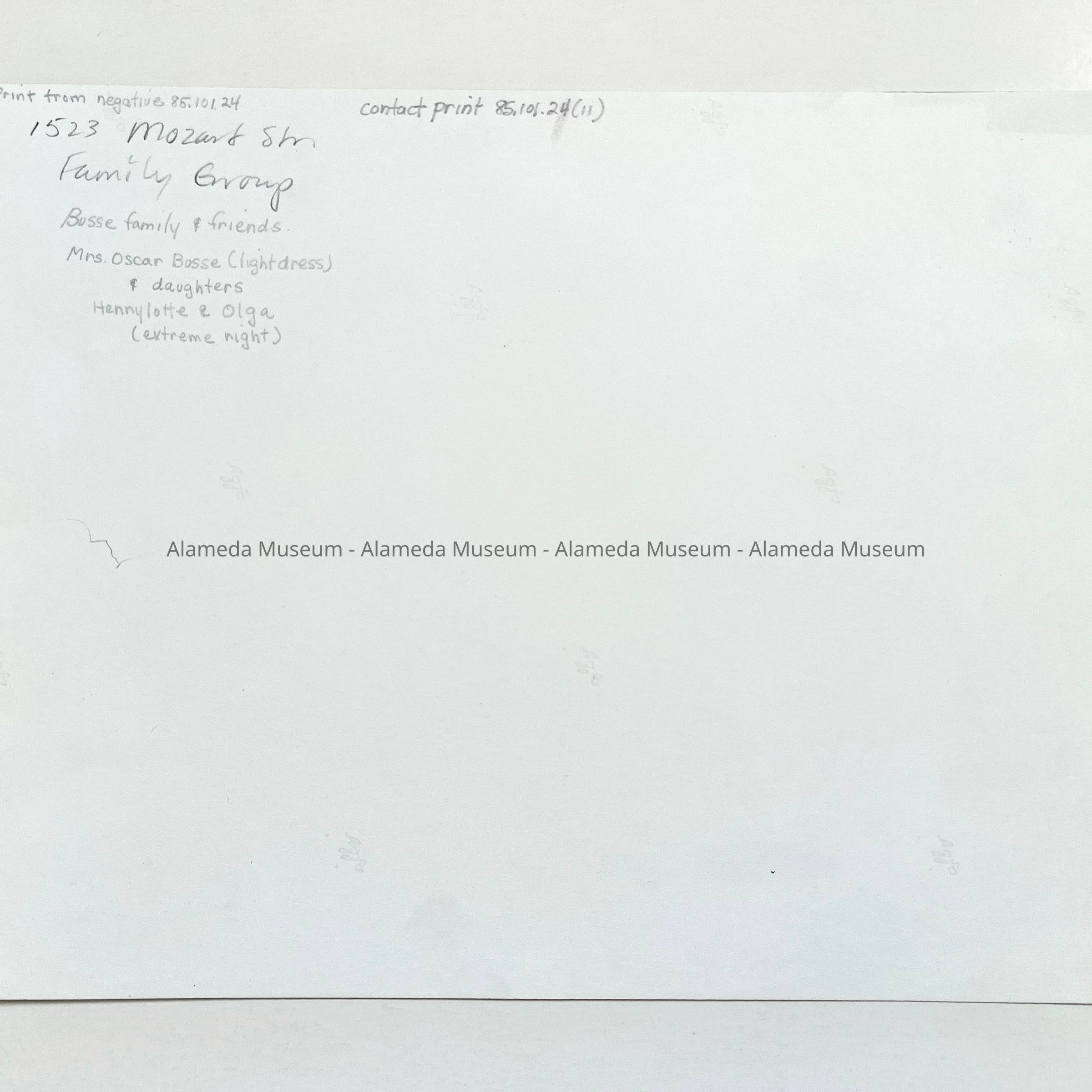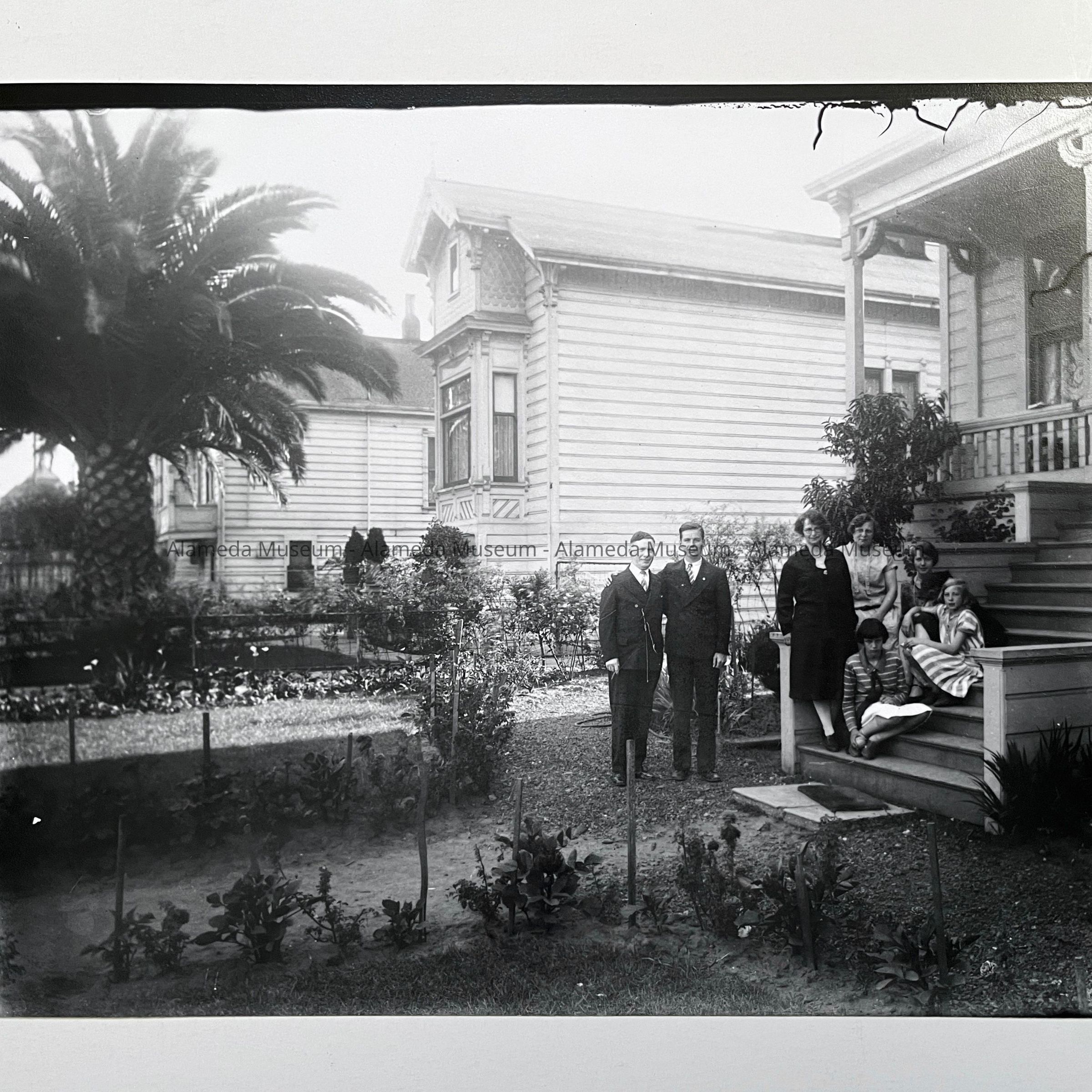 History of Object: Photo negative of Mrs. Oscar Busse & daughters Hennylotte & Olga (sitting on stairs) and family friends (unknown) in front of their home at 1523 Mozart Street.