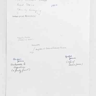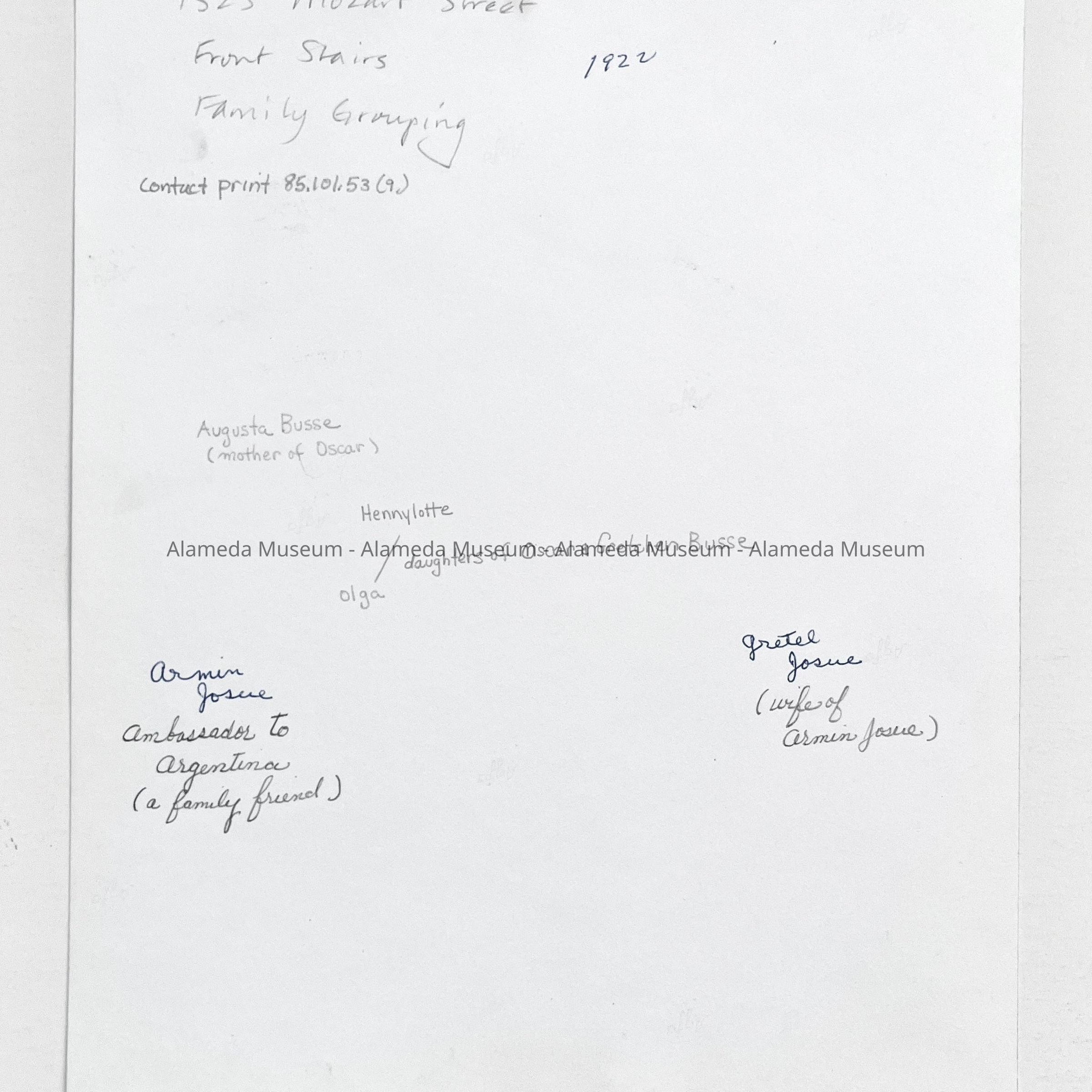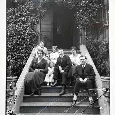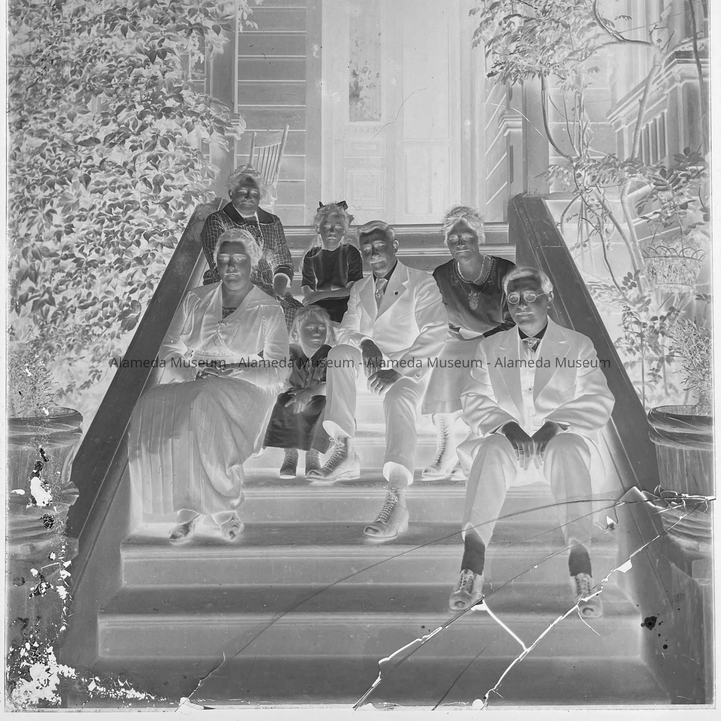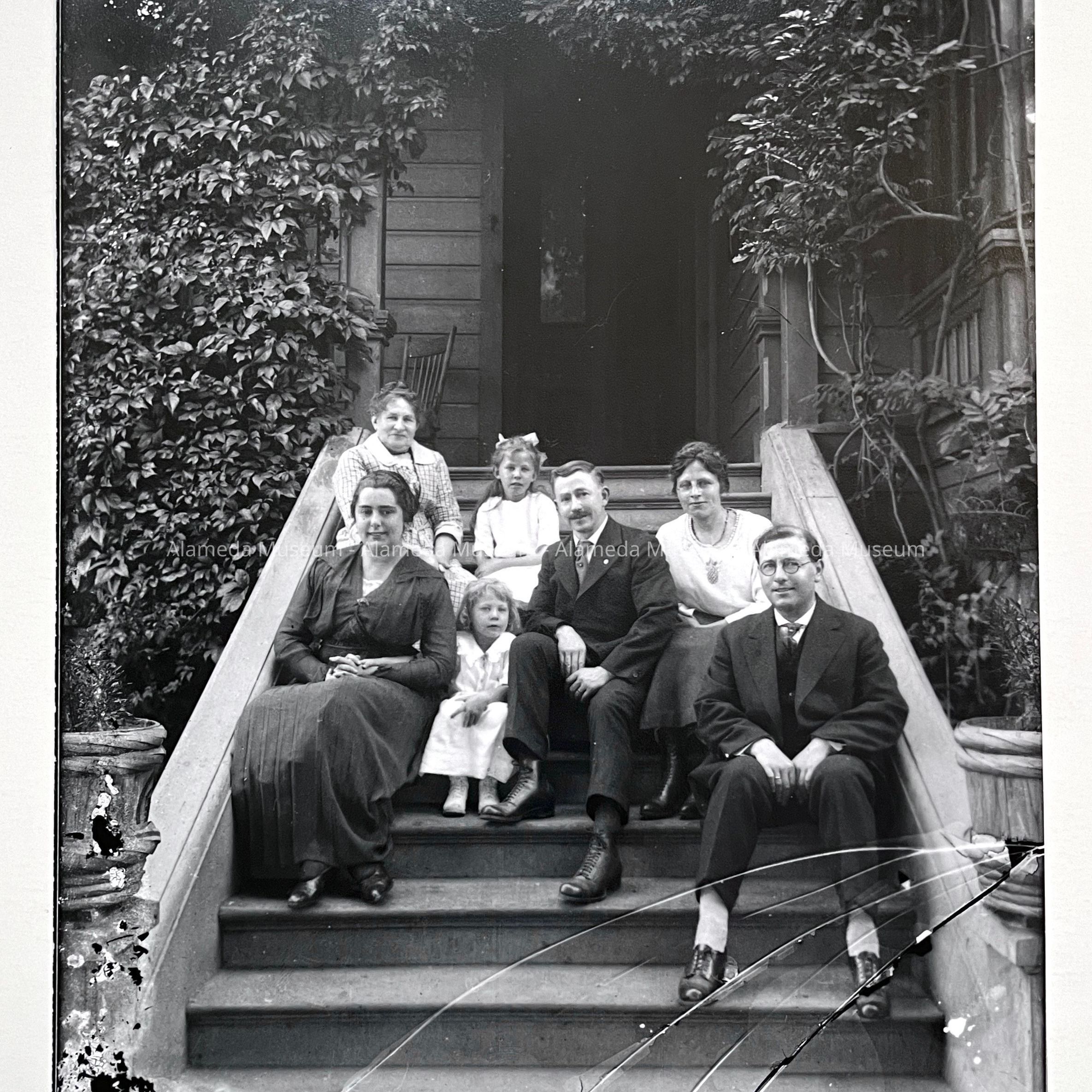 Photo negative of the Busse family (Oscar & Gretchen, and their two daughters Hennylotte & Olga, & grandmother Augusta Busse) with family friends Armin Josue (Ambassador to Argentina) and wife Gretel. They are posed on the front stairs of the Busse residence, 1523 Mozart Street, Alameda.