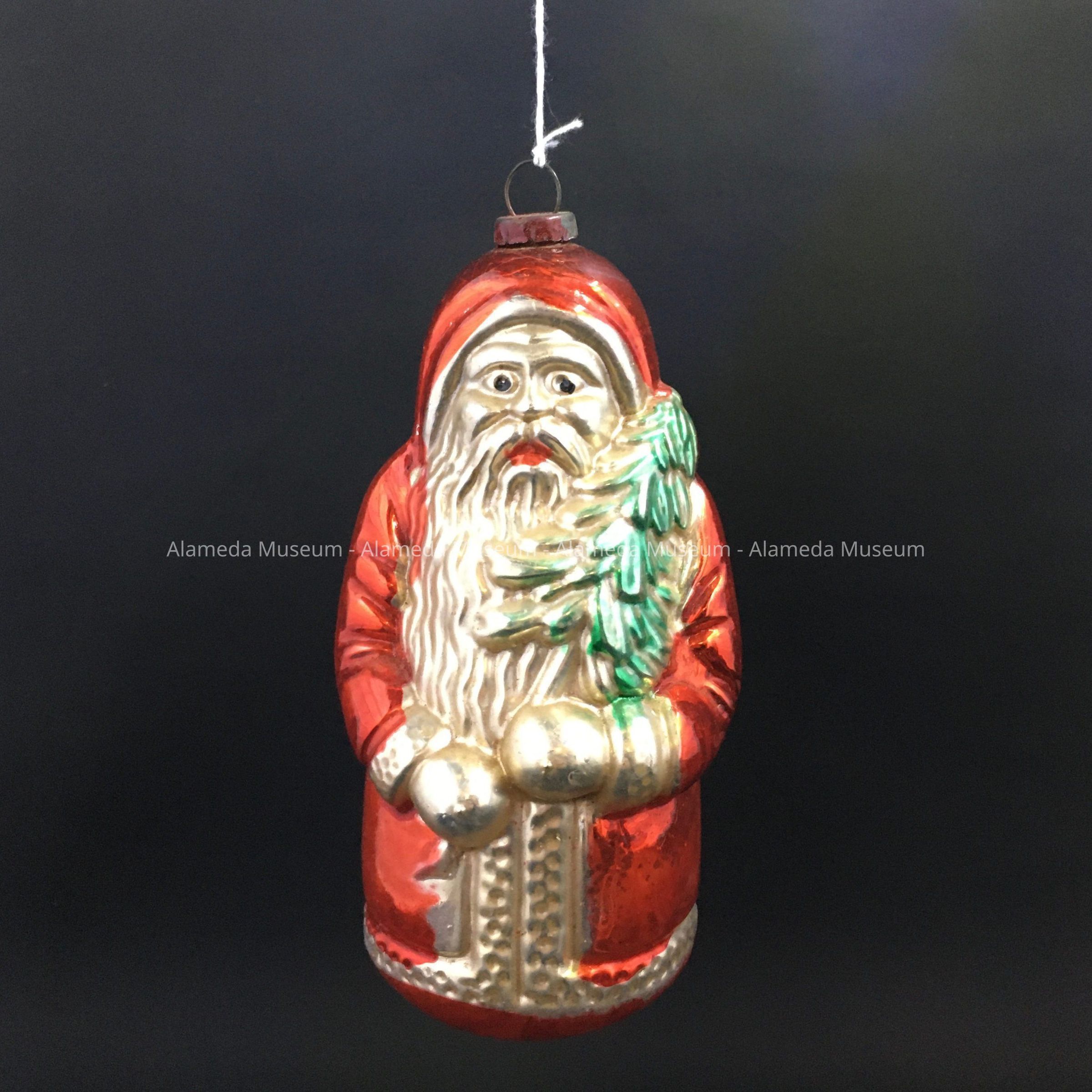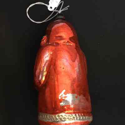 Description: A larger glass ornament in the shape of a Santa Clause in robe with hood. The robe is edged in the center, sleeves, and on the bottom with bands of pitted silver glass simulating fur. The figure is wearing silver-colored mittens and carrying a silver-and-green colored fir tree.