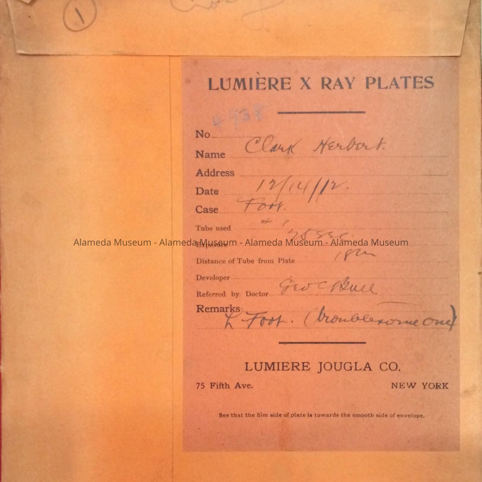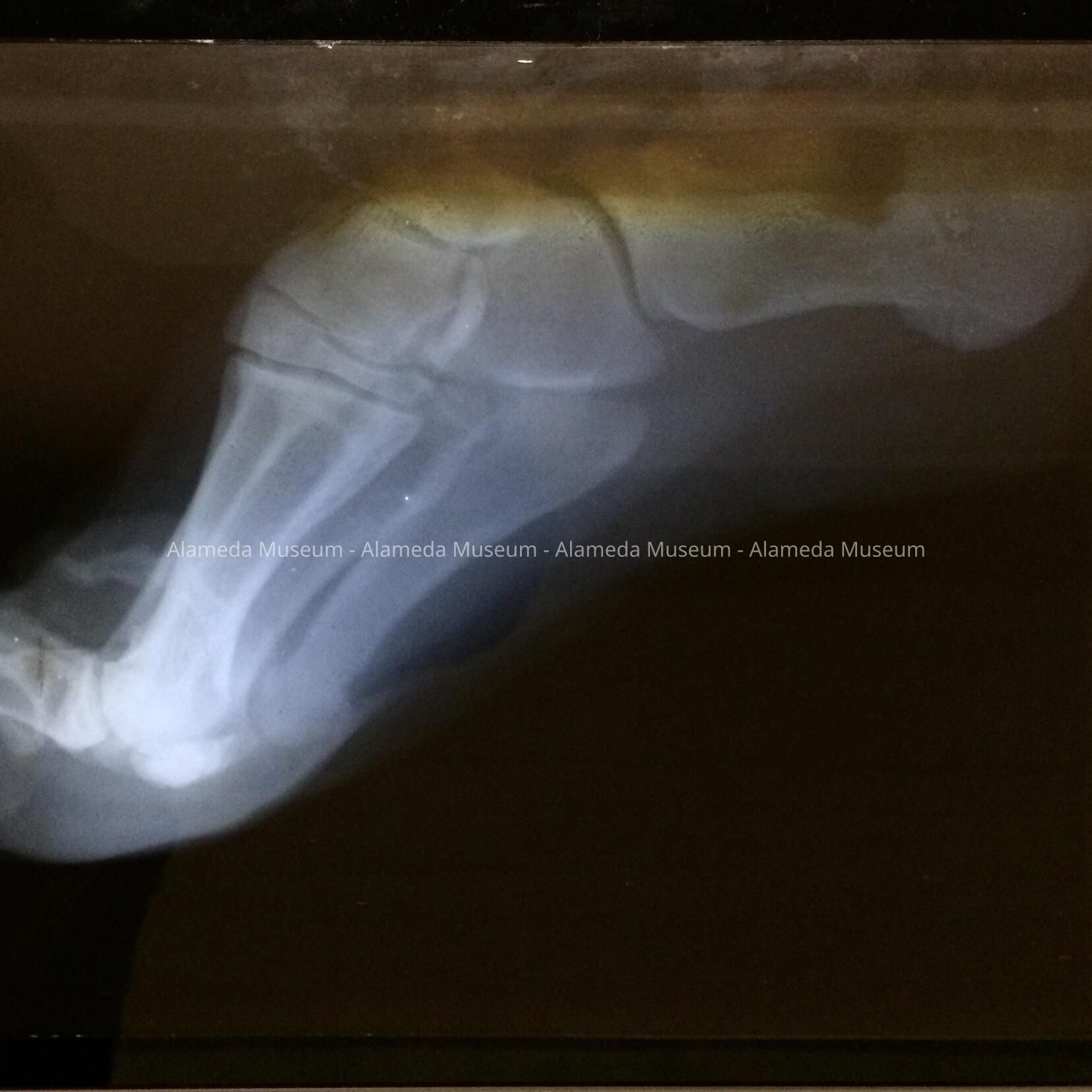 History of Object: X-ray of the left foot of Herbert Clark, made 12-14-12, by the order of Dr. George Bull, prominent Alameda doctor who died in 1913.