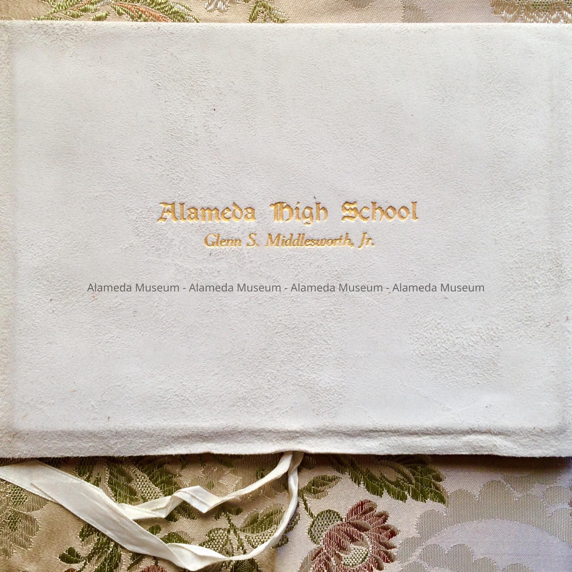 Description: White kid folder (or cover) incised with gold lettering, stating "Alameda High School, Glenn S. Middlesworth, Jr." Fastened by white silk ribbons the interior of the folder is lined with gold silk that forms a pocket. This pocket contains an elaborately printed diploma on imitation parchment paper, with an embossed gold seal of the Alameda Board of Education. The diploma is signed by Everett E. Farwell, Pres. Board of Education, and Geo. C. Thompson, Principal of the A.H.S.
