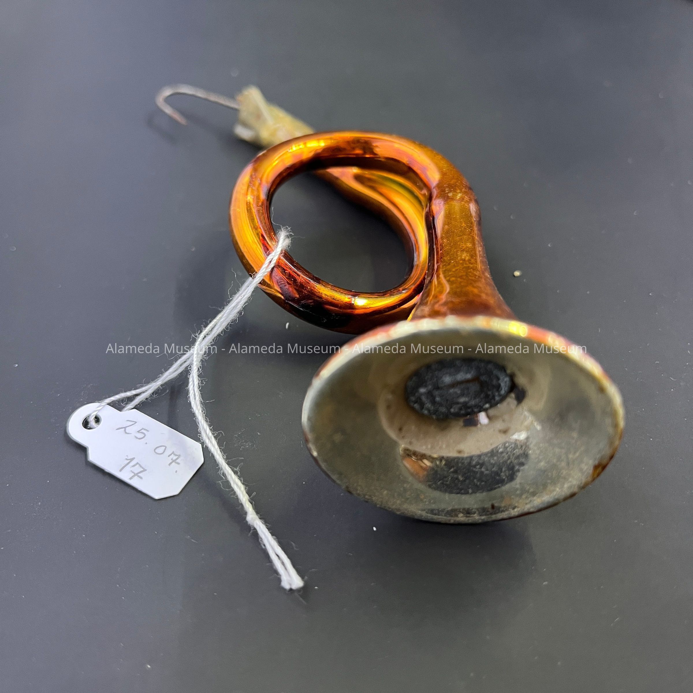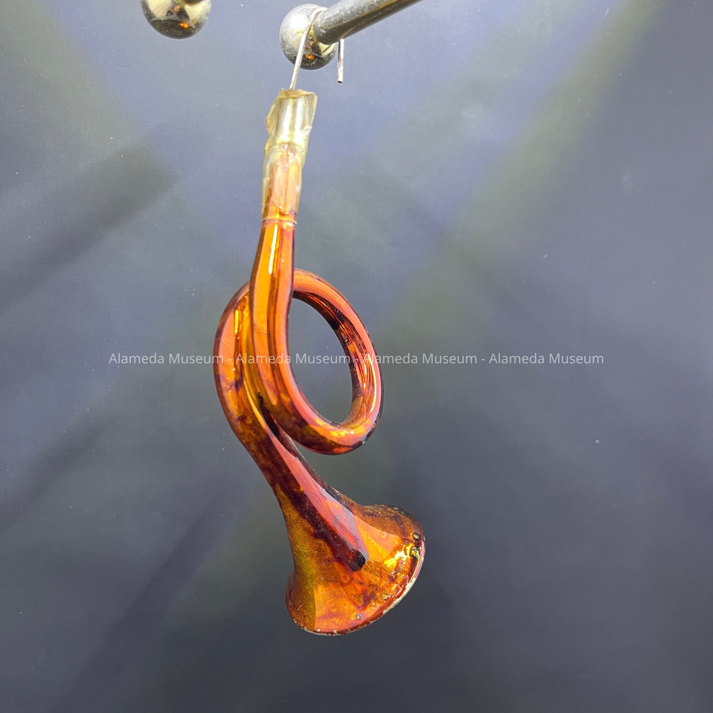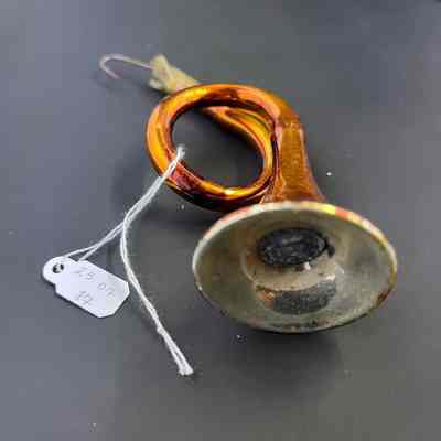 Description: This instrument is made of mercury glass in a gold color. Shaped as a French Horn, the hook looks to have been broken and fastened back onto the ornament with some tape.