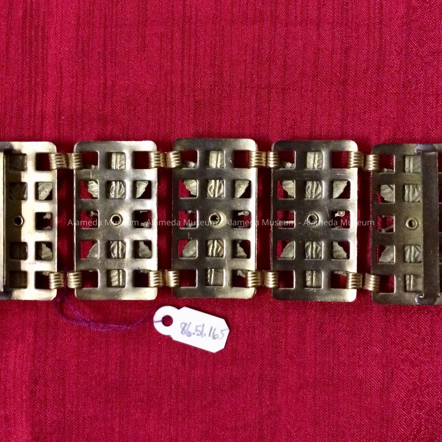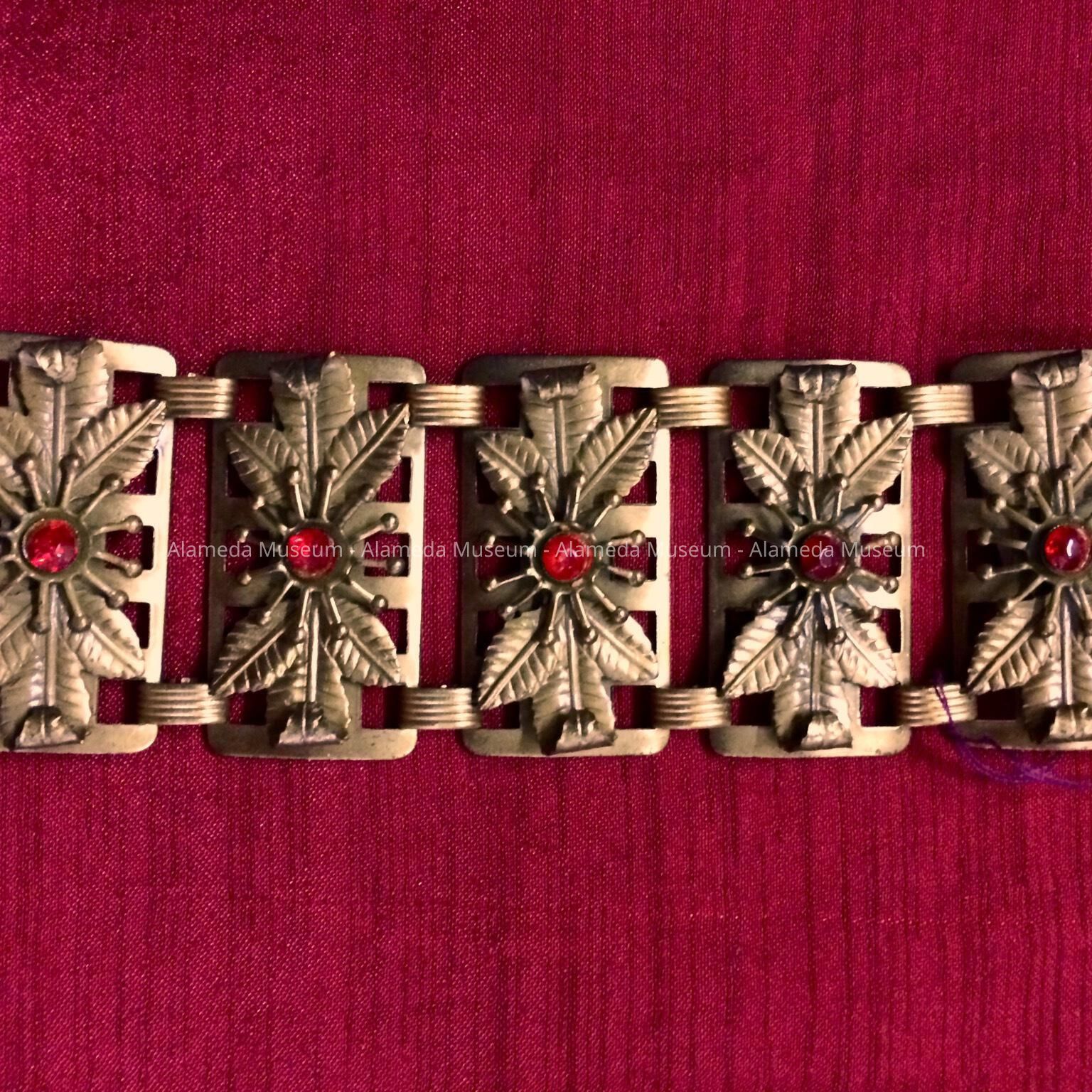 Description: Gold plated brass buckle consisting of five (5) panels with applied stylized leaves and flowers with red colored glass insets.