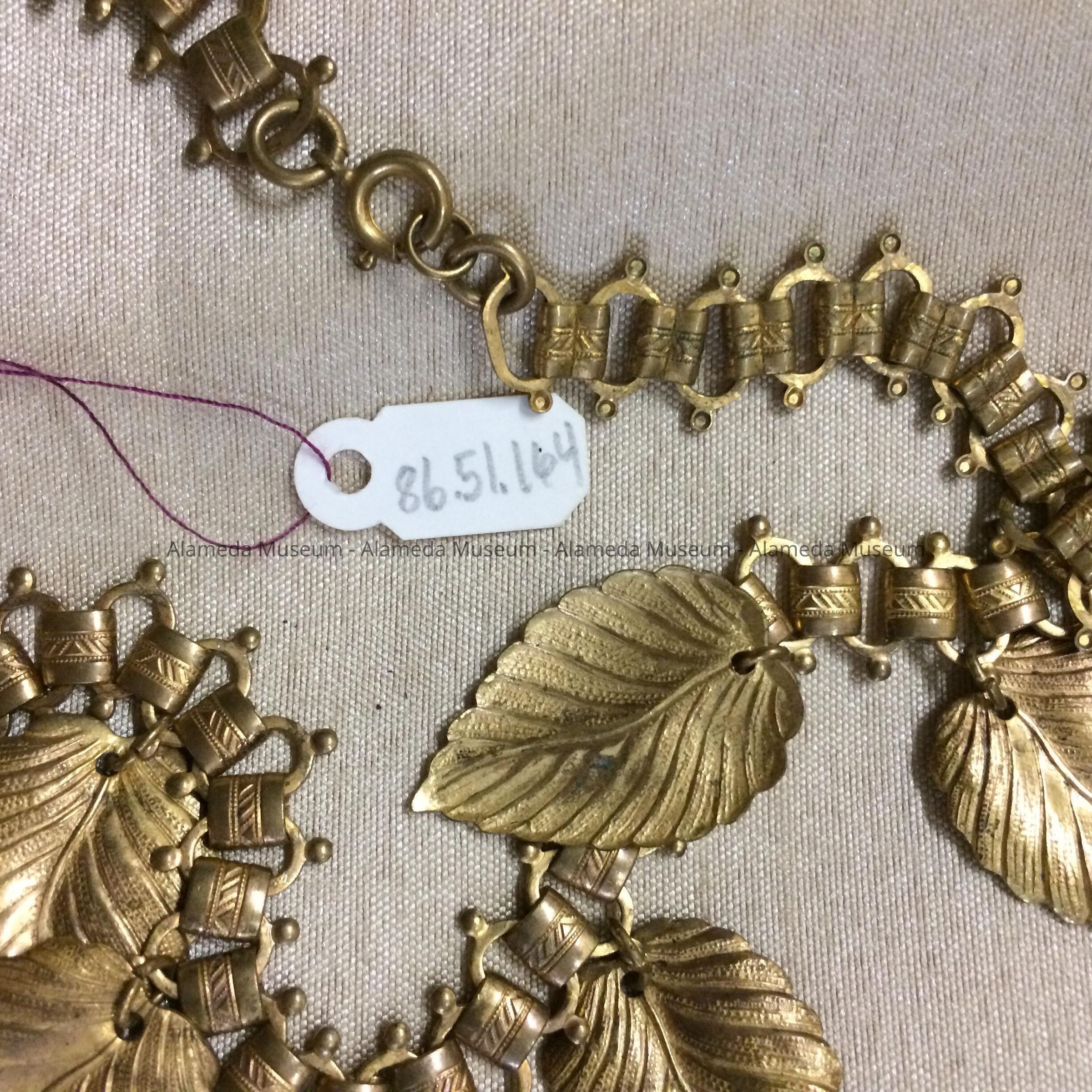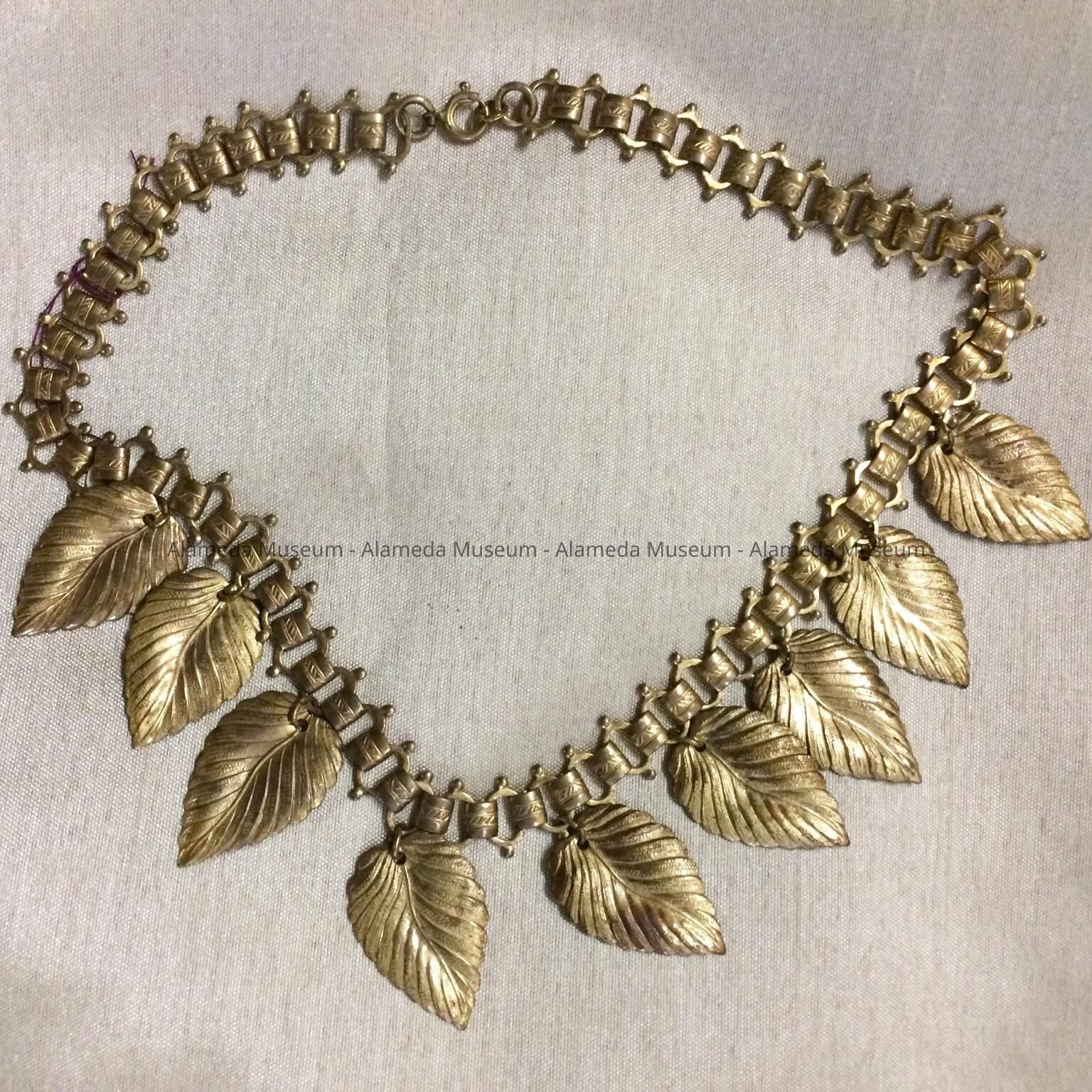 Description: Necklace appears to be gold plated brass consisting of chain links with suspended leaves.