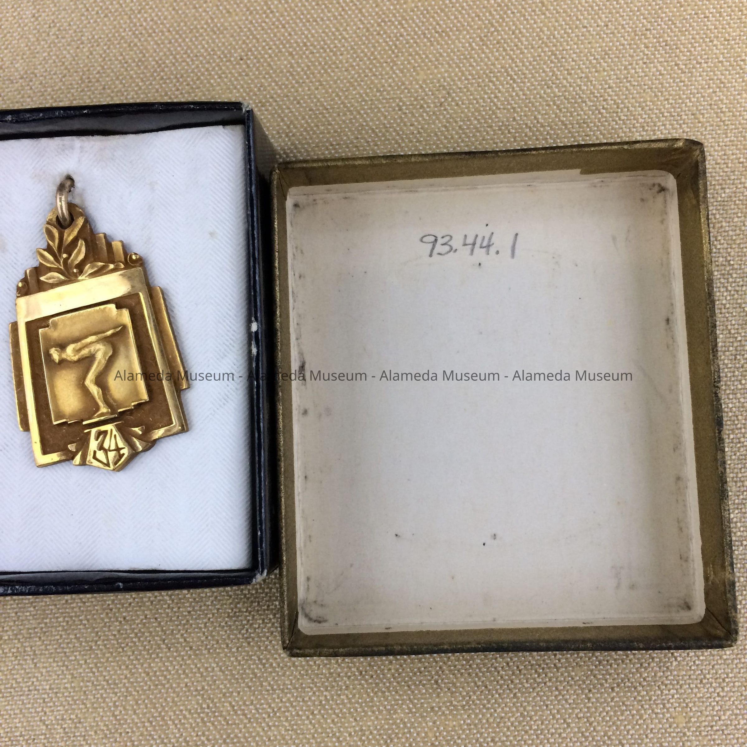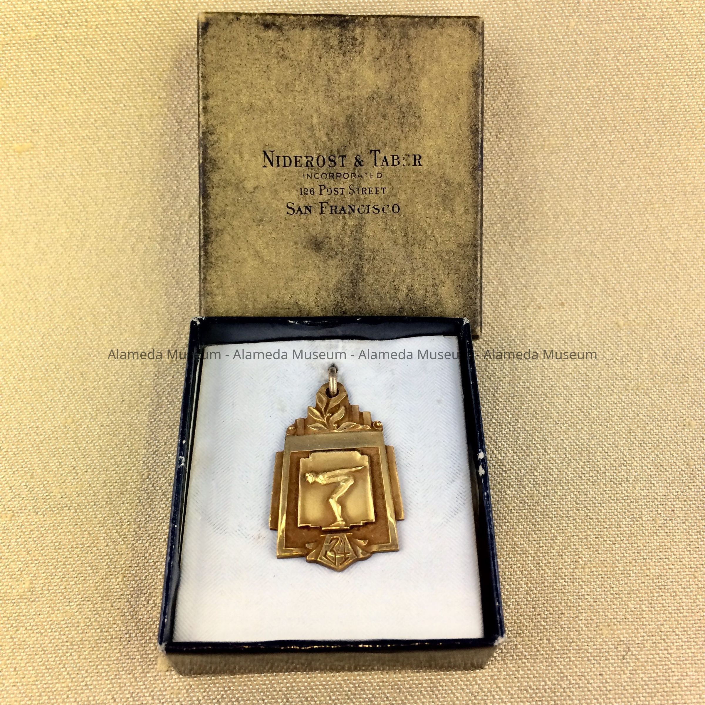 GOLD-PLATED MEDAL, WITH CENTER MOTIF OF DIVING FIGURE AND INCISED NUMBER "34." MEDAL IS MOUNTED TO WHITE PAPER BACKING IN ORIGINAL GOLD- AND BLACK-COLORED CARDBOARD BOX. BOX COVER IS INSCRIBED, "NIDEROST AND TABER, POST STREET, SAN FRANCISCO."
