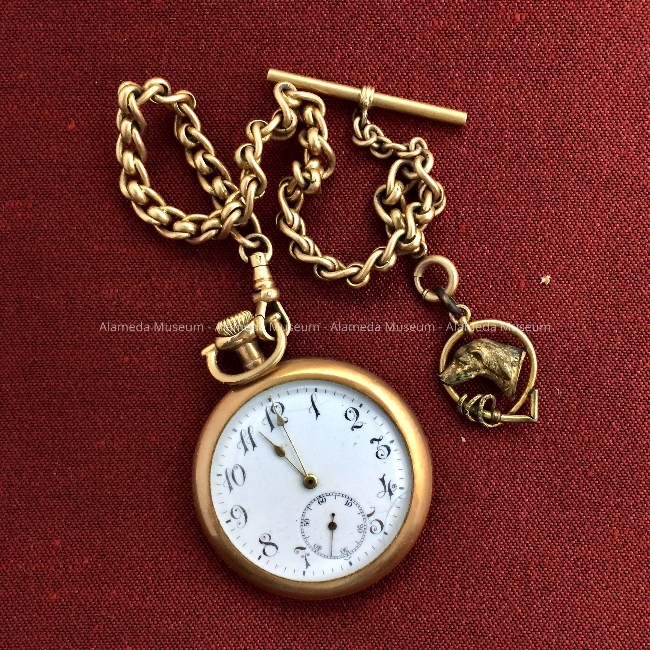 GOLD-PLATED POCKET WATCH, OPEN-FACE, ATTACHED TO CHAIN WITH GOLD-PLATED FOB. FOB HAS DOG MOTIF IN RELIEF. MAKE OF WATCH UNKNOWN, BUT APPEARS TO BE OF AMERICAN MANUFACTURE.