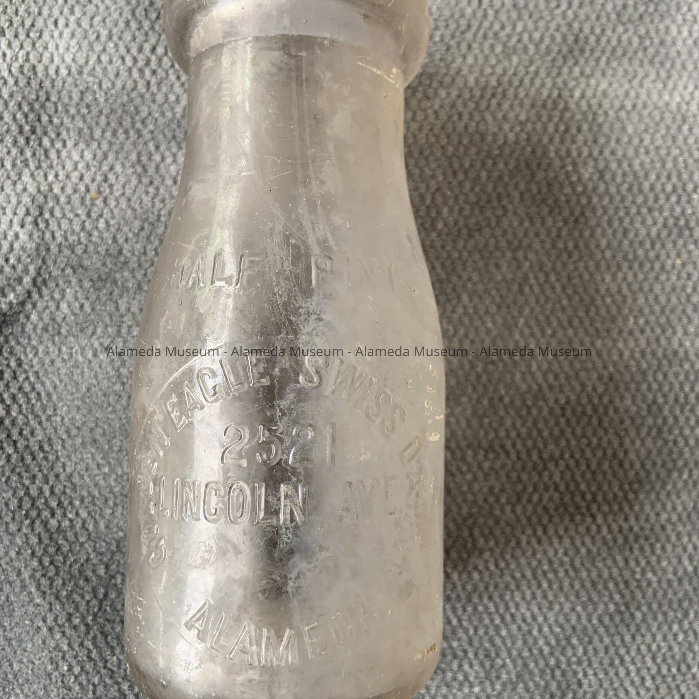 Description: Half pint milk bottle, raised lettering in circular-like label stating "Golden Eagle Swiss Dairy, 2521 Lincoln Ave., Alameda", and above this label "half pint". Bottle has a protruding lip with recessed ledge for supporting paper top.